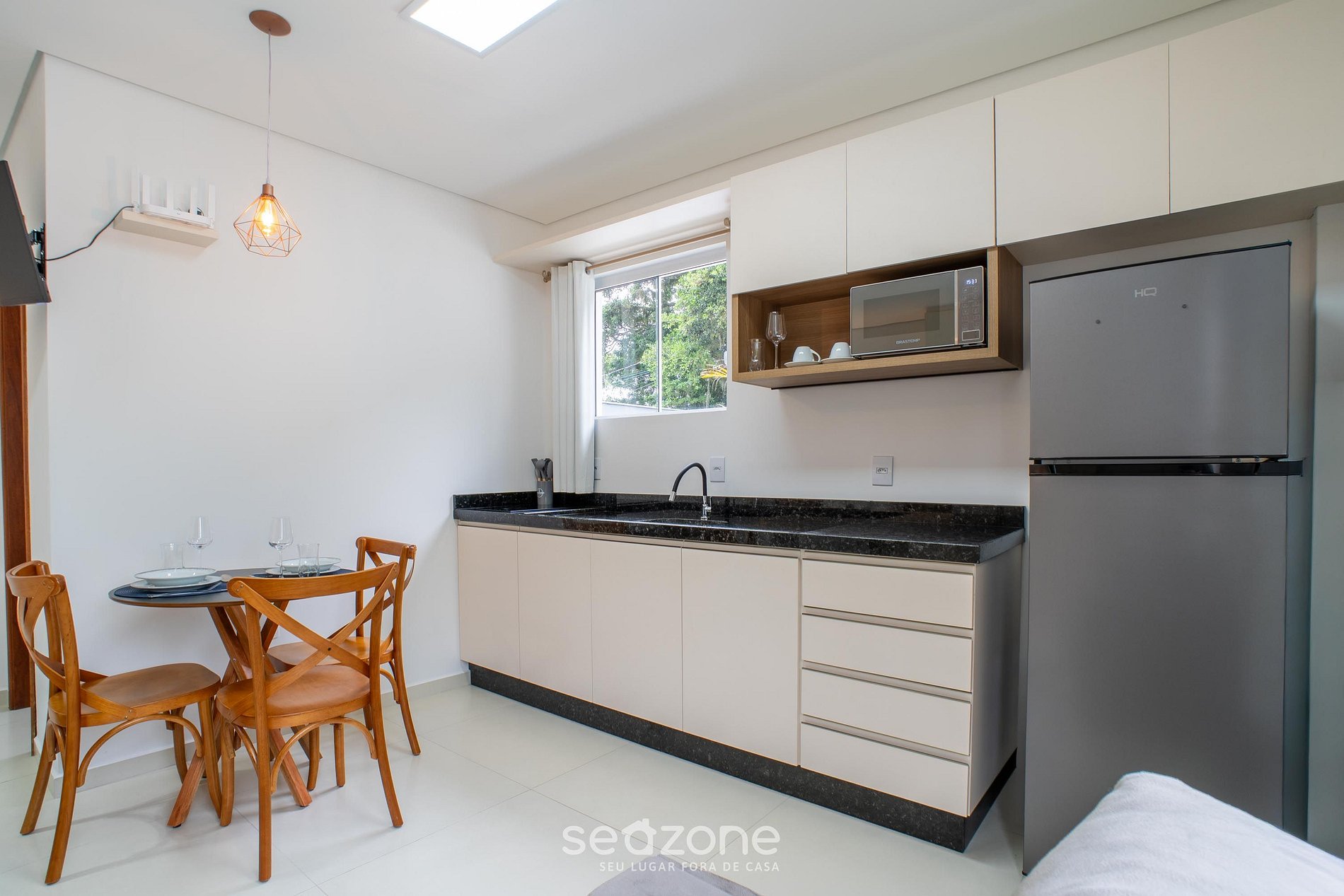 - Cozinha com geladeira, fogão cooktop de indução, micro-ondas, sanduicheira, cafeteira elétrica, chaleira elétrica, liquidificador, taças de vinho, panelas, louças e utensílios;