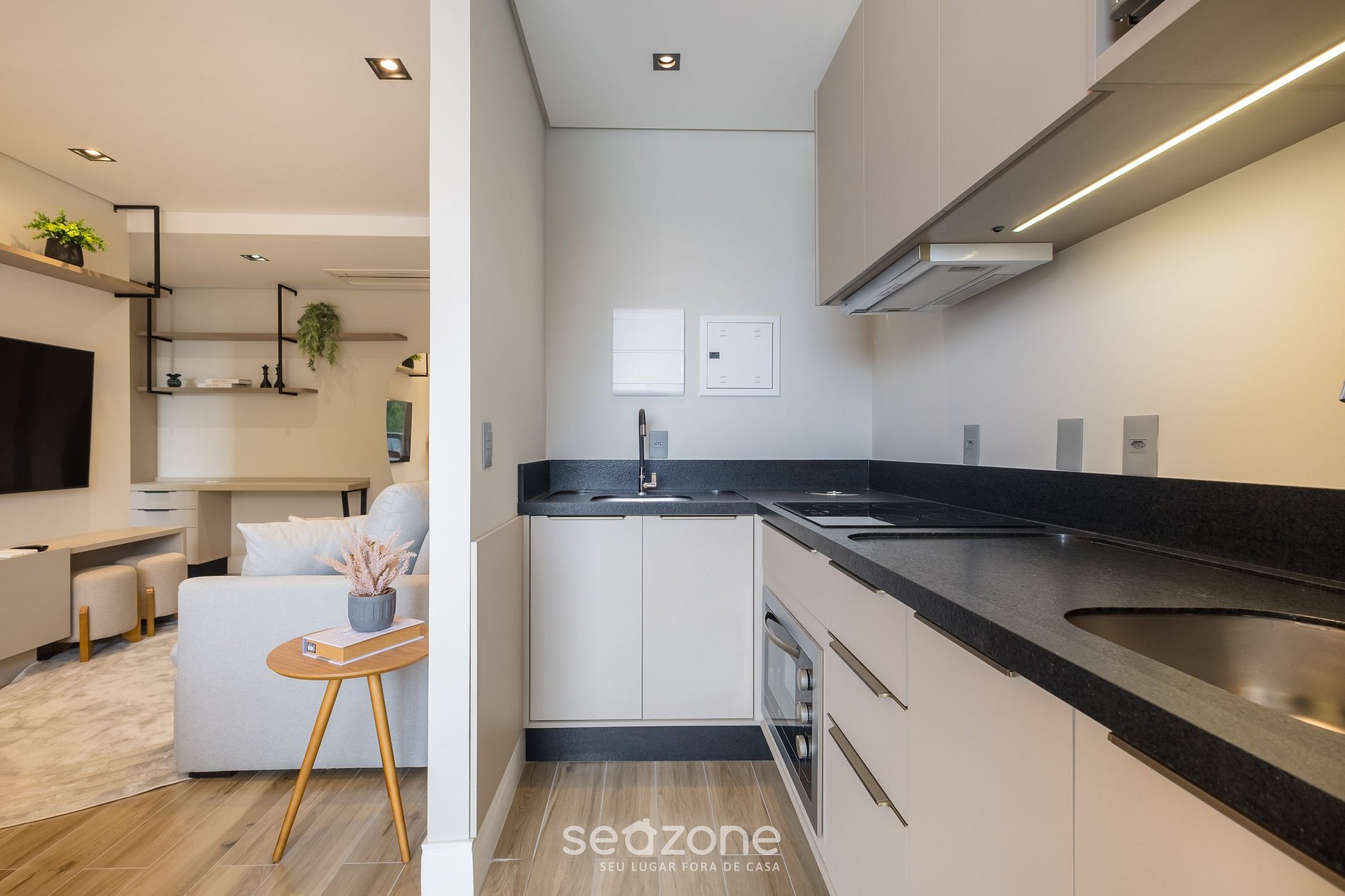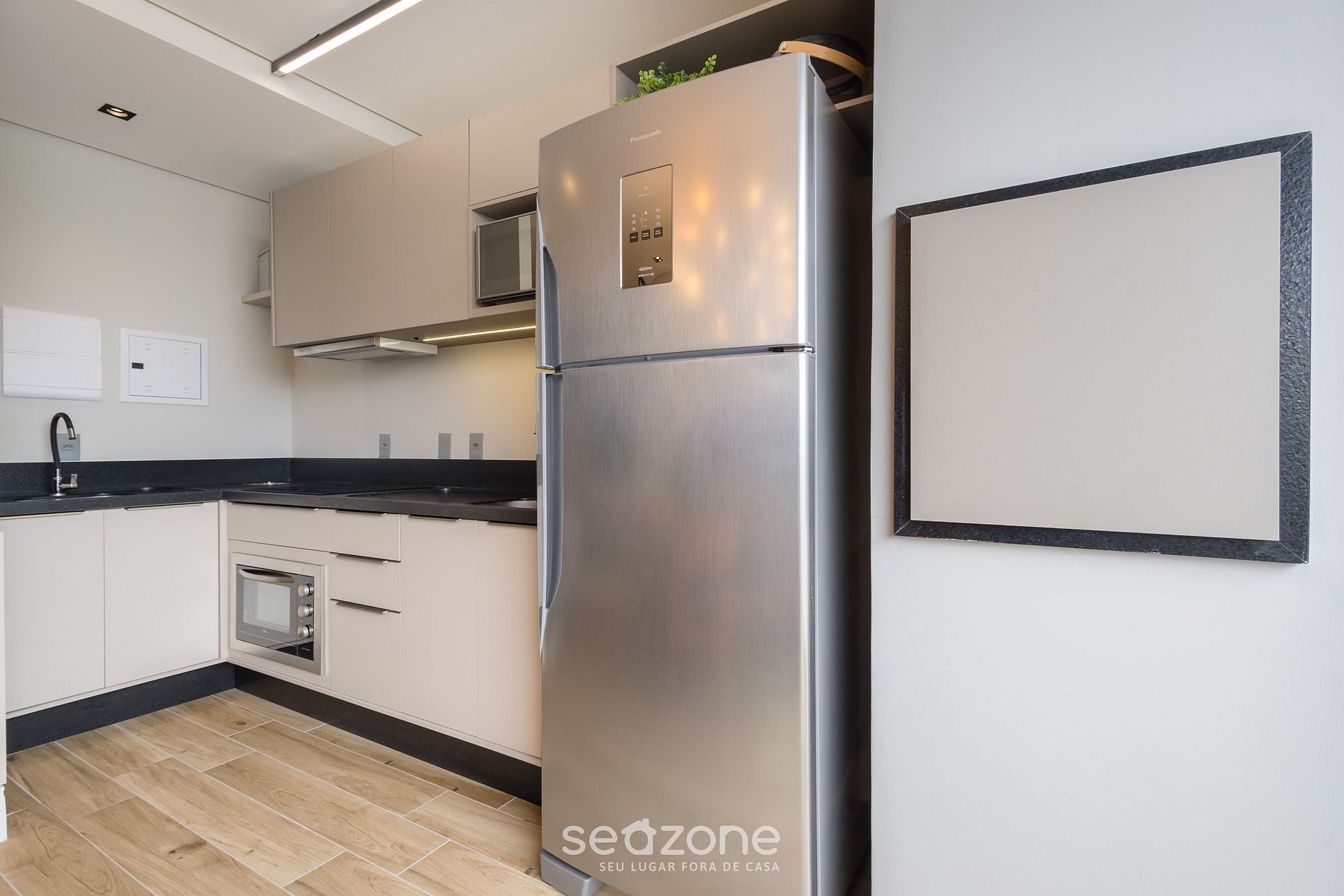 - Cozinha completa com geladeira, fogão cooktop de indução, forno elétrico, micro-ondas, sanduicheira, cafeteira elétrica, chaleira elétrica, liquidificador, taças de vinho, panelas, louças e utensílios;