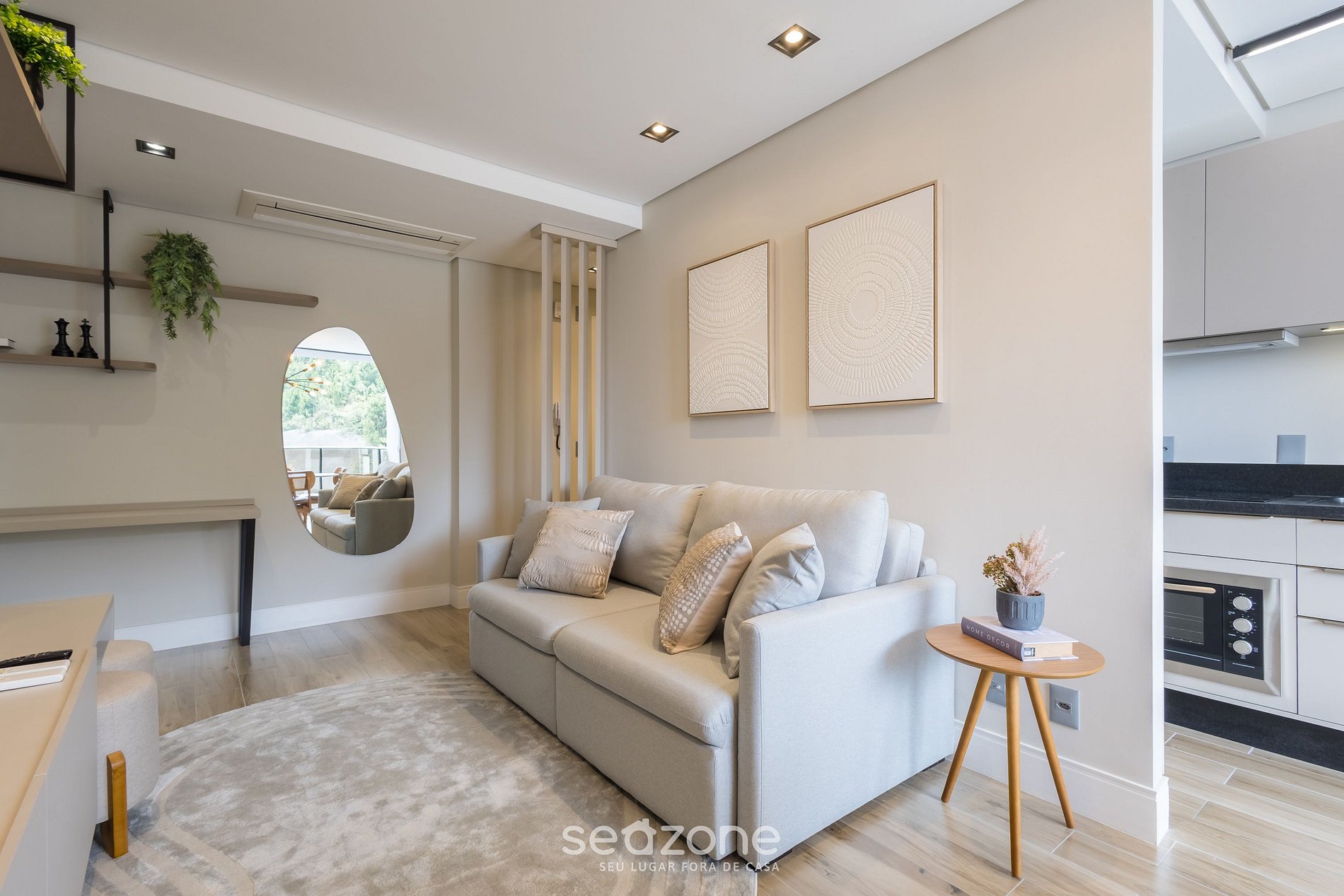 - Sala de estar com sofá, Smart TV e ar-condicionado;