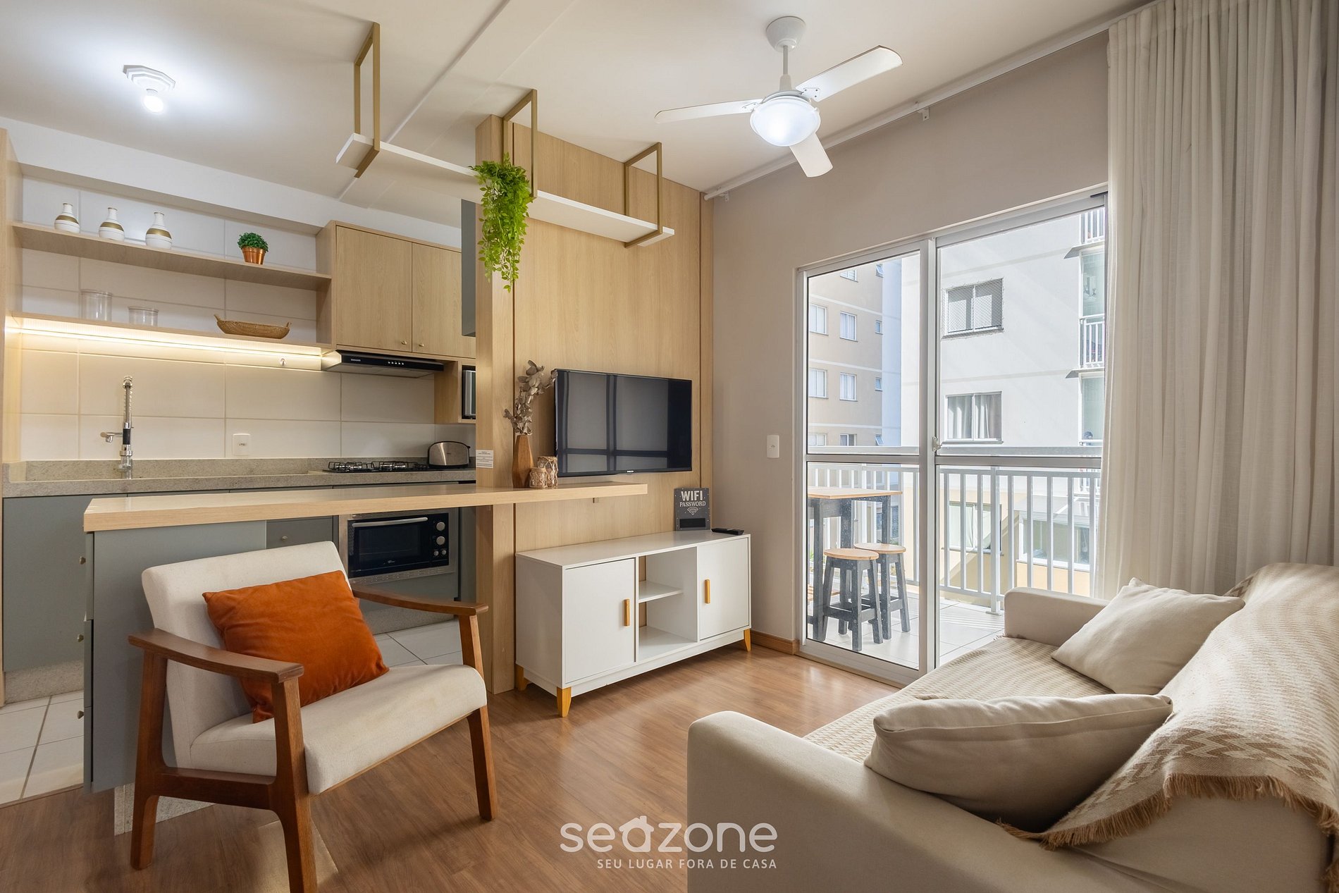 - Sala de estar com ventilador de teto e Smart TV;