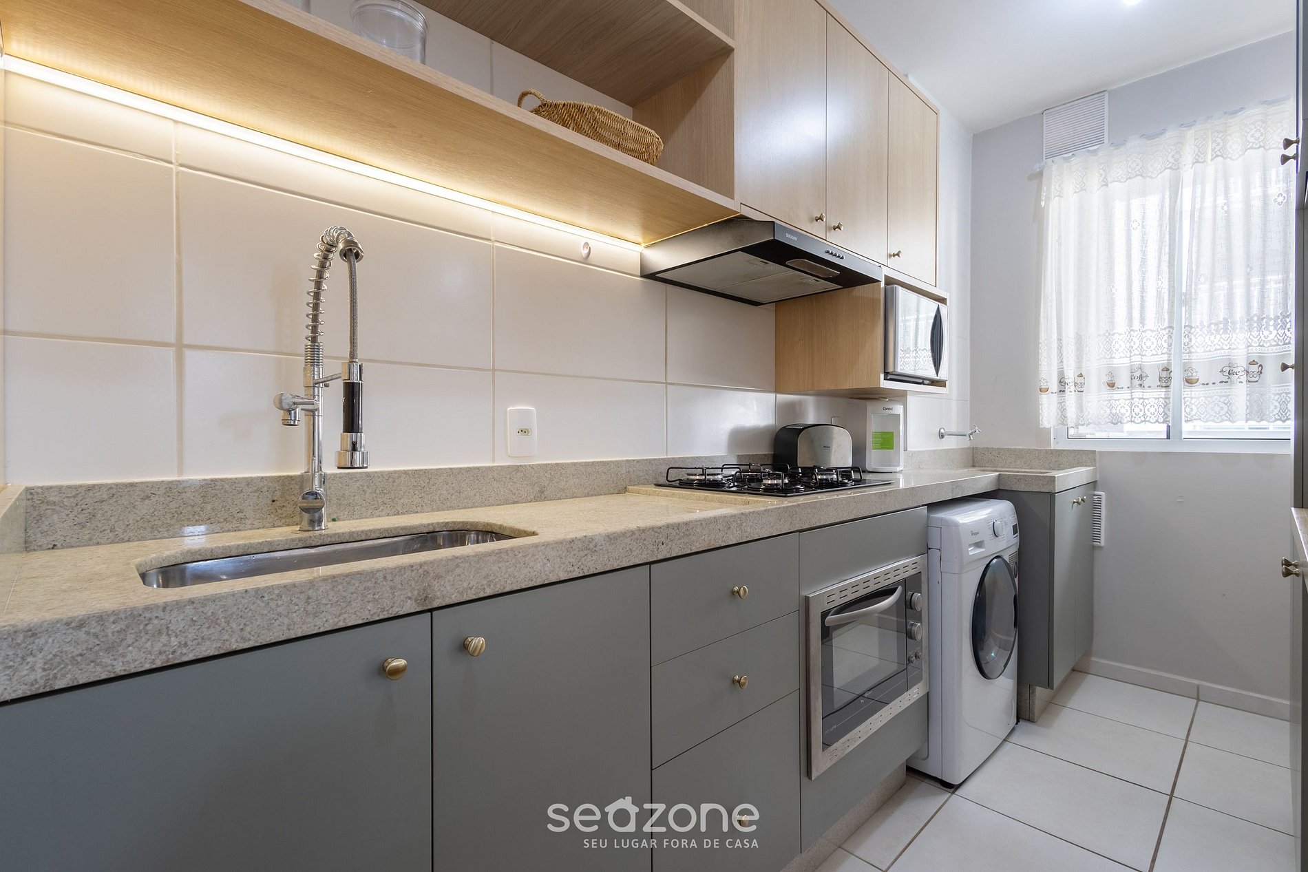 - Cozinha completa com geladeira, fogão cooktop, forno elétrico, micro-ondas, sanduicheira, torradeira, kit café (suporte para filtro e garrafa térmica), chaleira elétrica, liquidificador, taças de vinho, panelas, louças e utensílios;