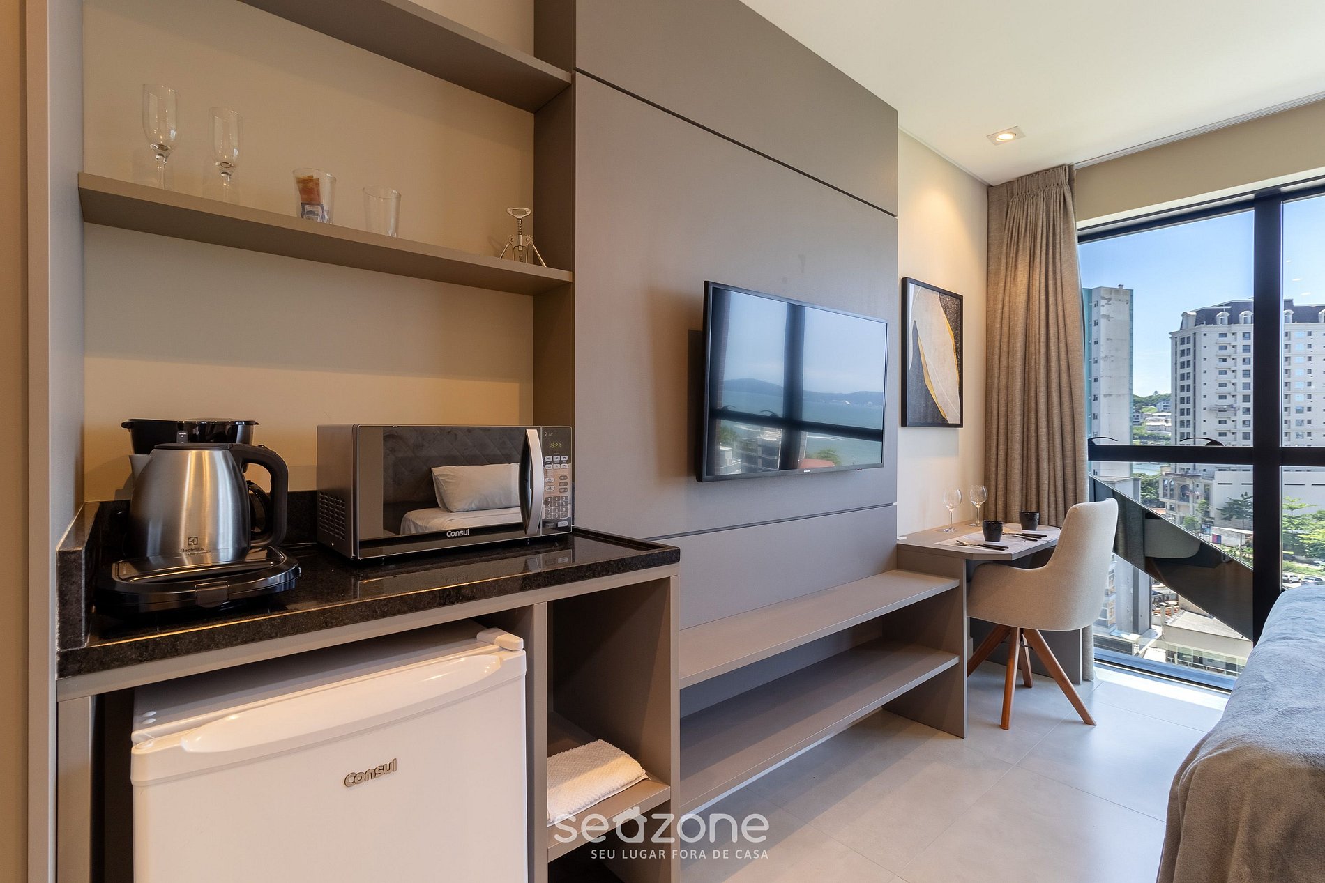 - Cozinha compacta com micro-ondas (sua opção prática para refeições rápidas durante a estadia), além de frigobar, cafeteira, chaleira elétrica, sanduicheira, taças de vinho, louças e utensílios essenciais para o dia a dia.