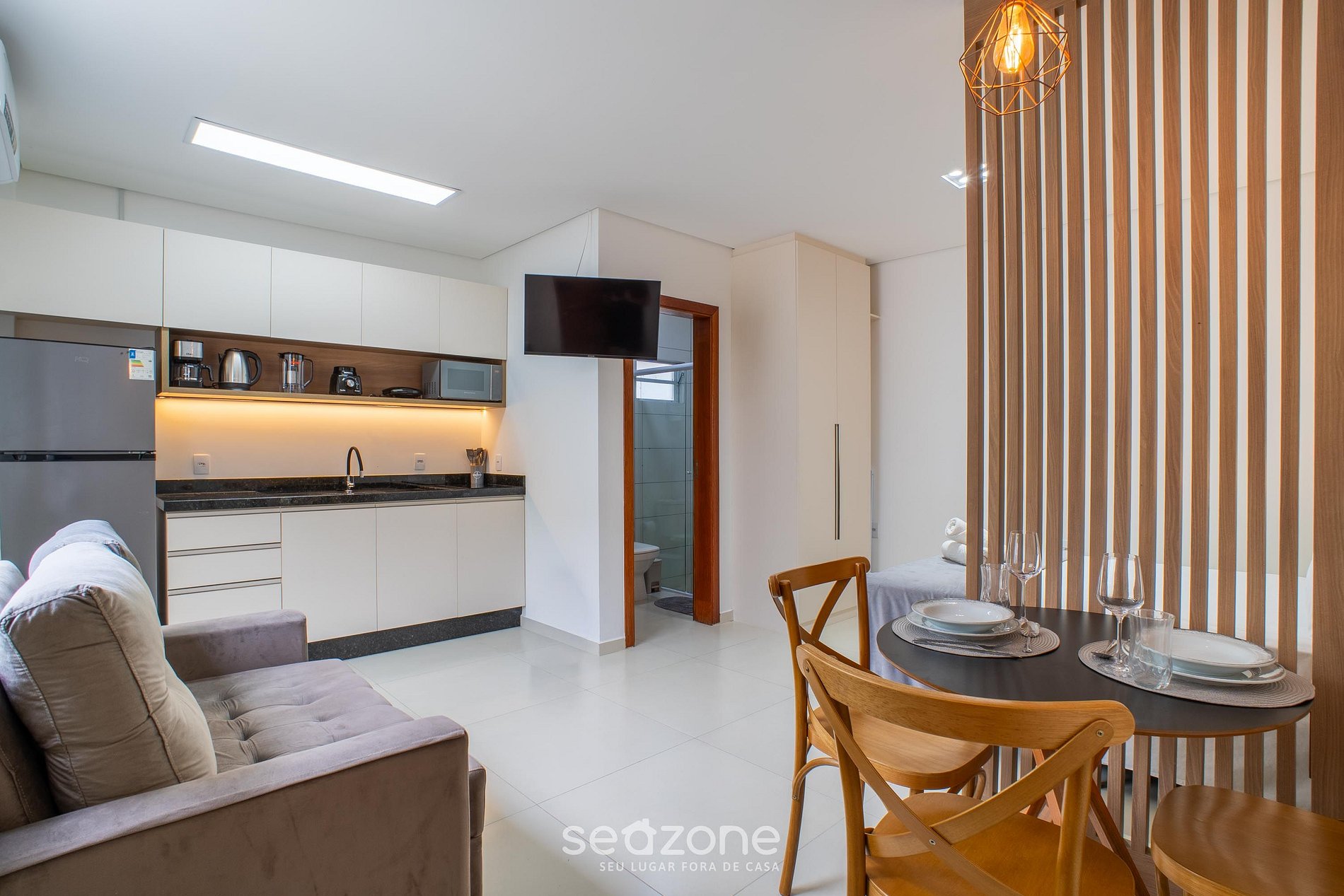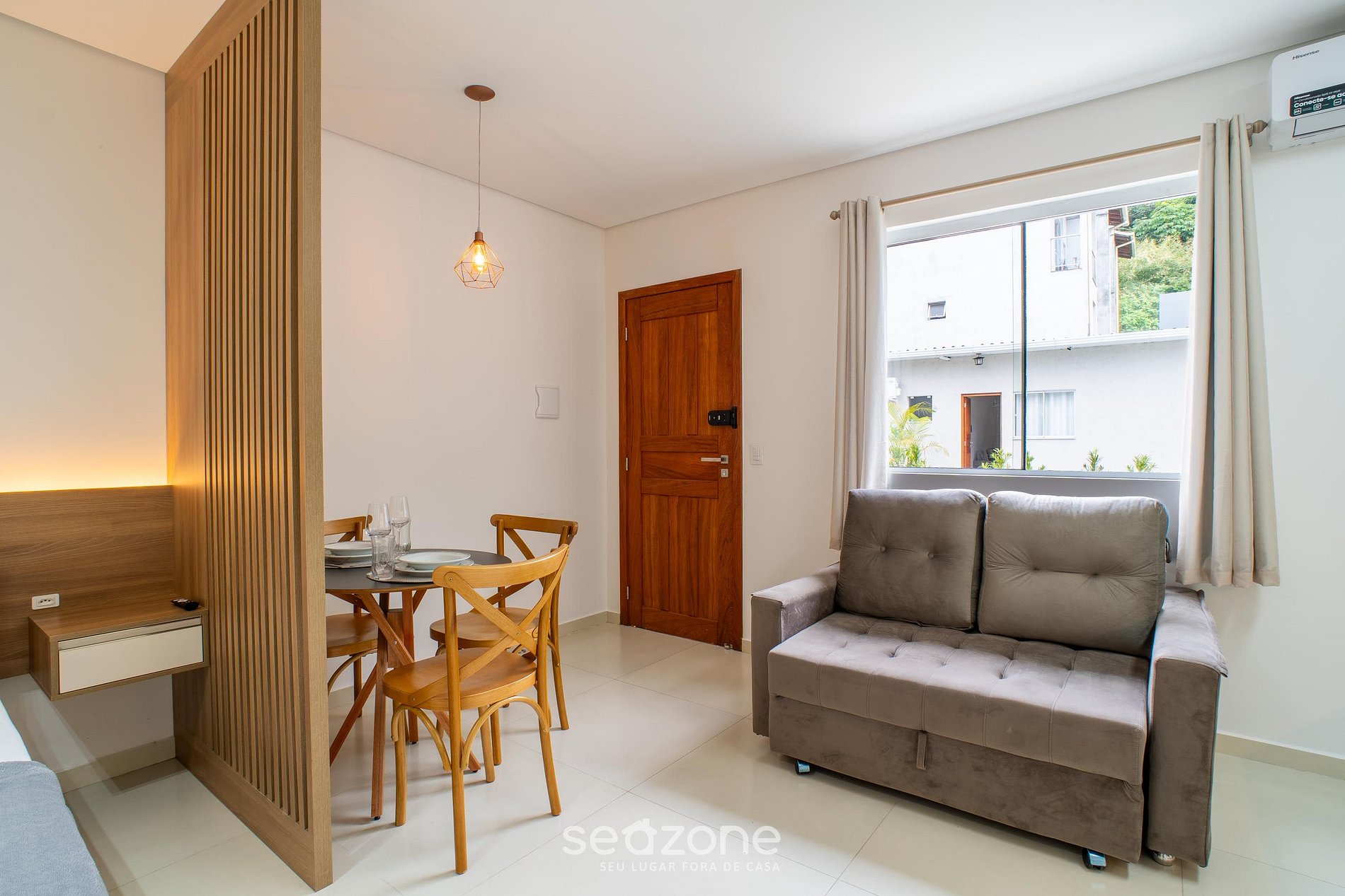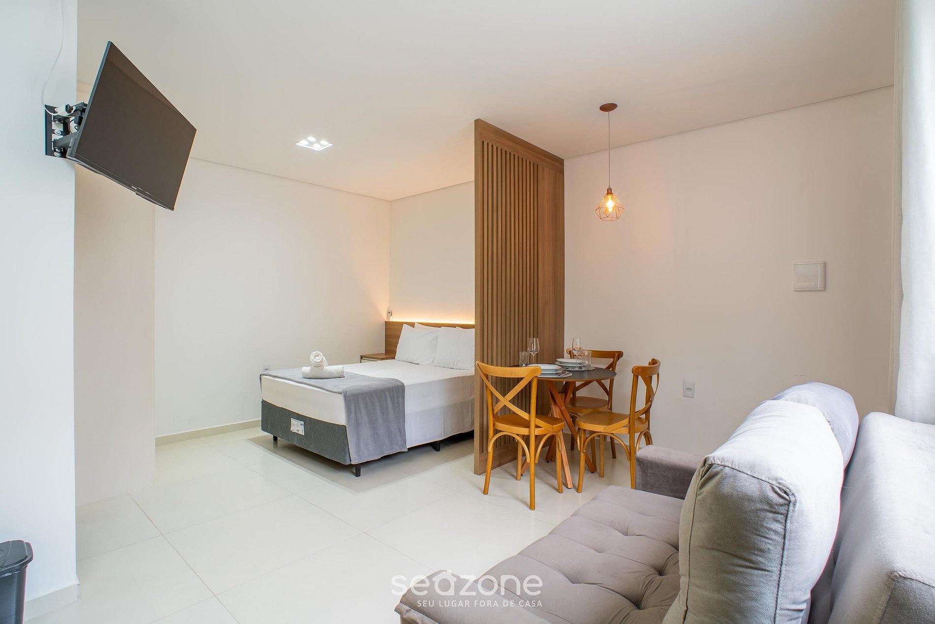 - Cama de casal, sofá, Smart TV, armário e ar-condicionado;