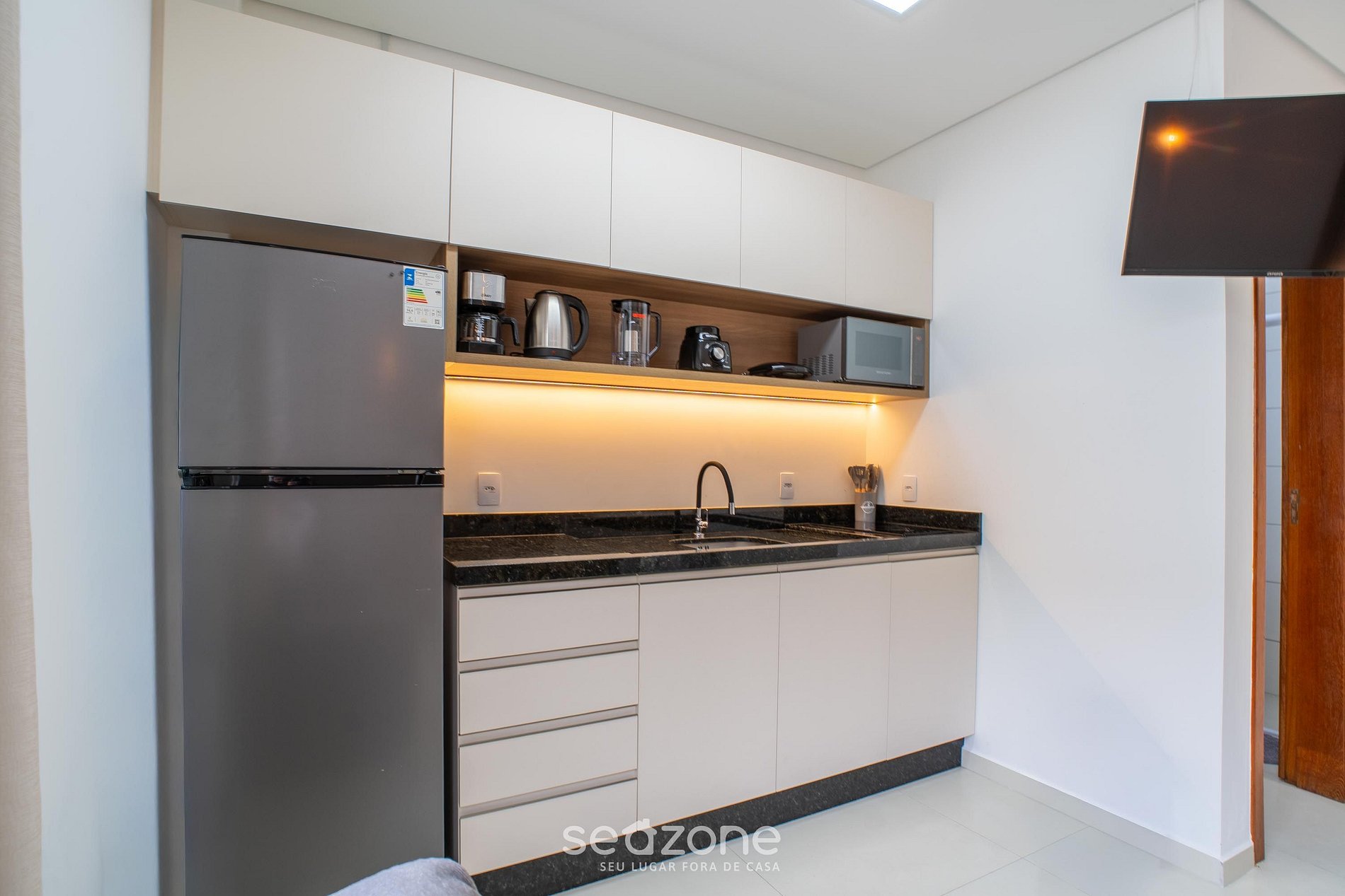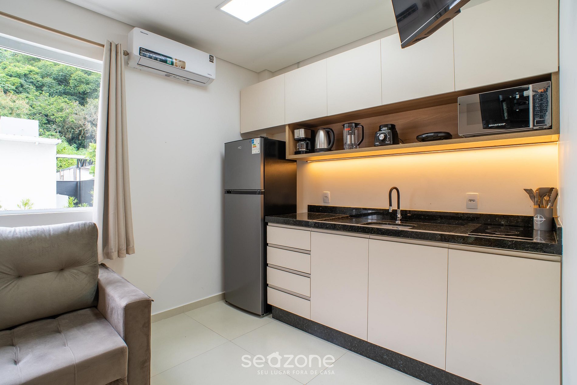 - Cozinha com geladeira, fogão cooktop de indução, micro-ondas, sanduicheira, cafeteira elétrica, chaleira elétrica, liquidificador, taças de vinho, panelas, louças e utensílios;