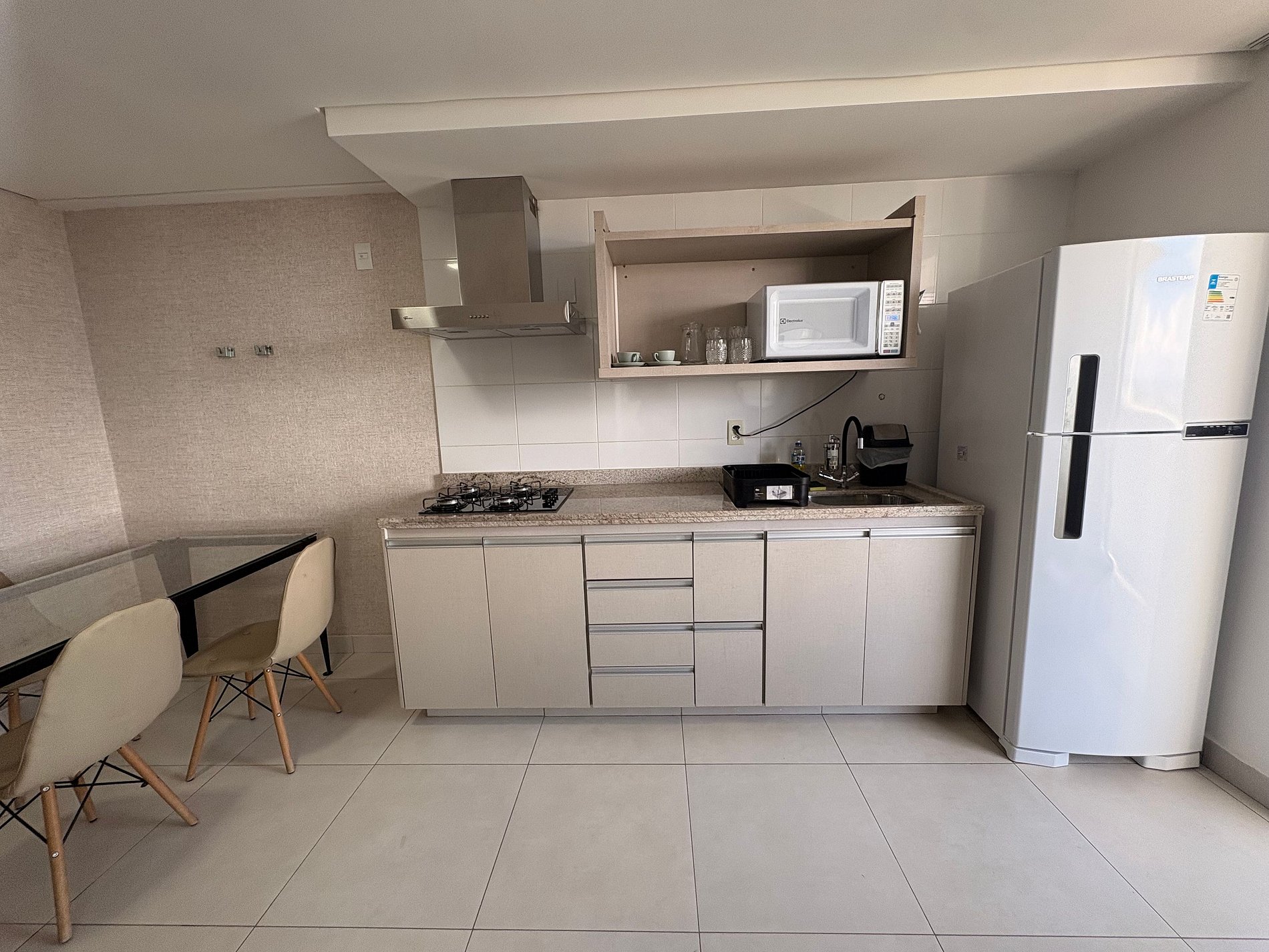 - Cozinha completa com geladeira, fogão cooktop, micro-ondas, sanduicheira, cafeteira elétrica, chaleira, liquidificador, taças de vinho, panelas, louças e utensílios;