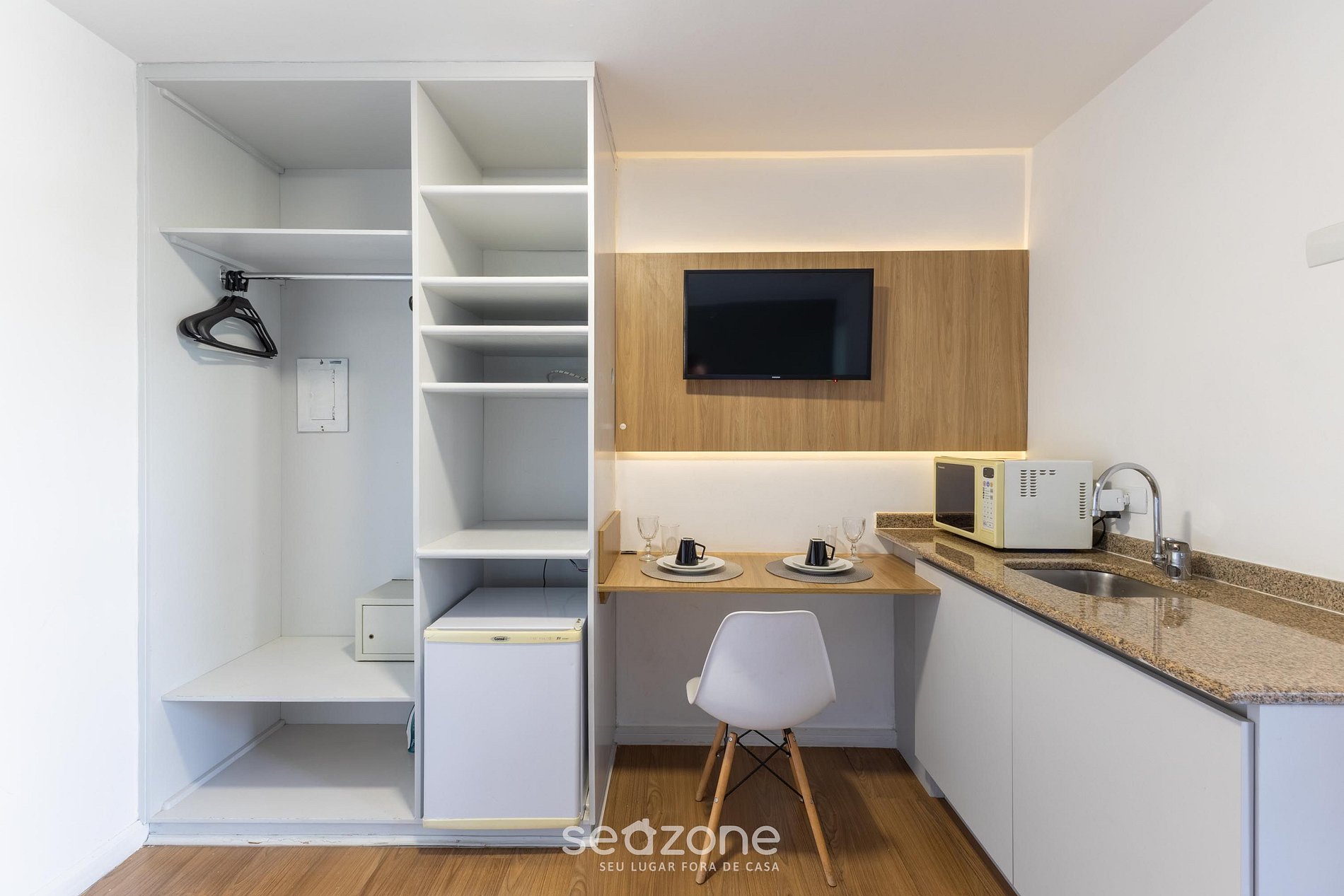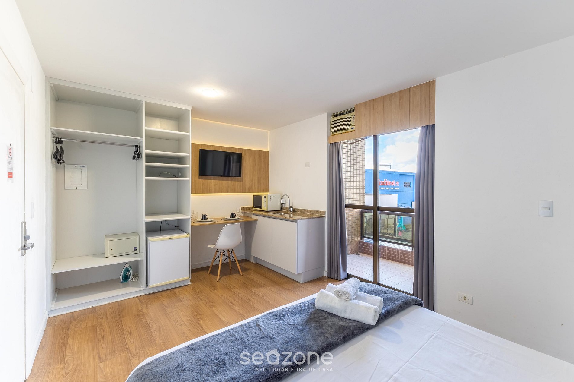 Studio projetado para oferecer conforto e funcionalidade, com cama queen, ar-condicionado, cozinha compacta equipada e uma varanda com uma agradável vista, tudo para sua conveniência. O condomínio conta ainda com excelente infraestrutura, incluindo portaria 24h, piscina e salão de jogos.