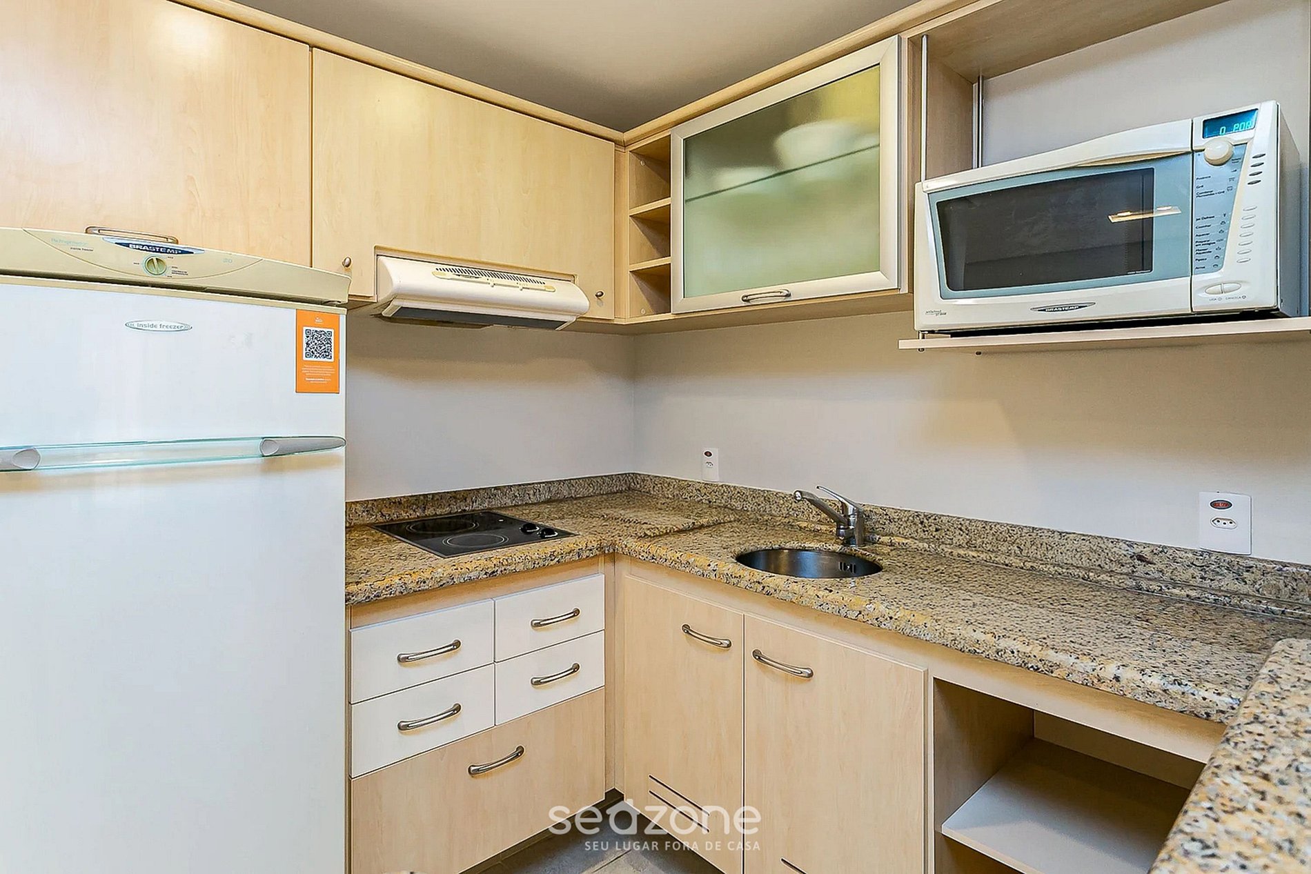 - Mini cozinha com fogão cooktop, micro-ondas e frigobar;