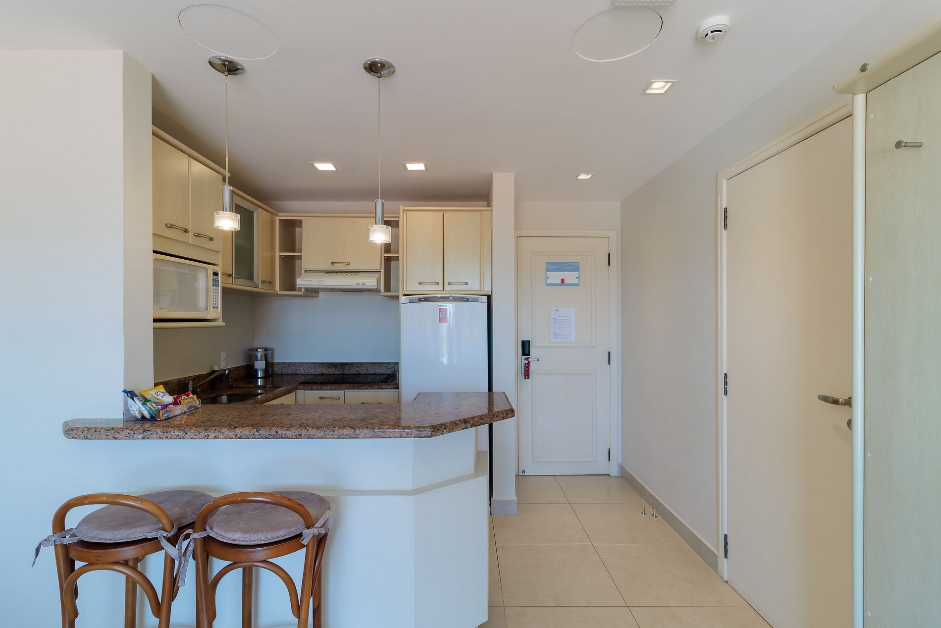- Mini cozinha com fogão cooktop, micro-ondas, frigobar e utensílios domésticos;