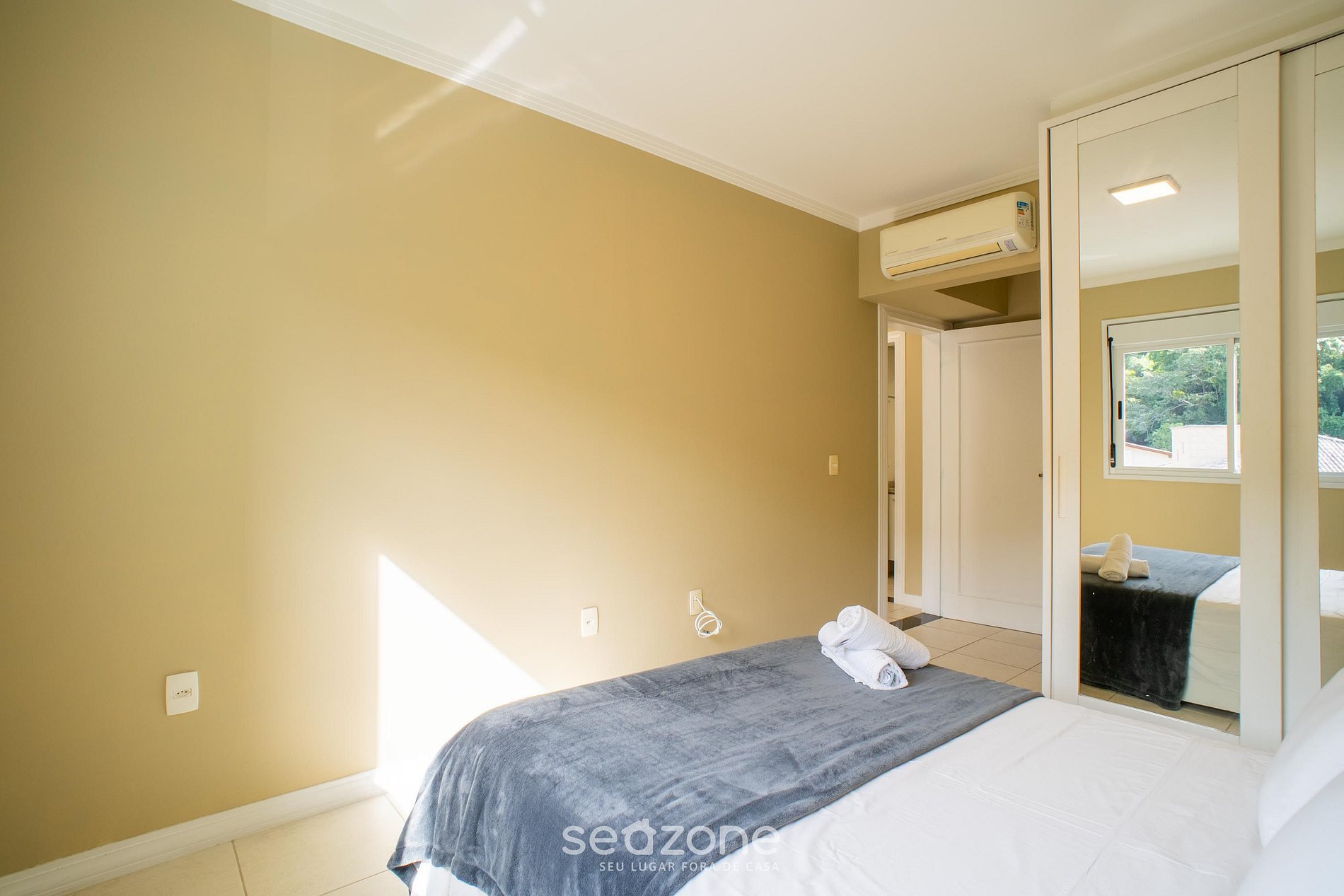 - 1 Quarto com cama de casal, armário e ar-condicionado;