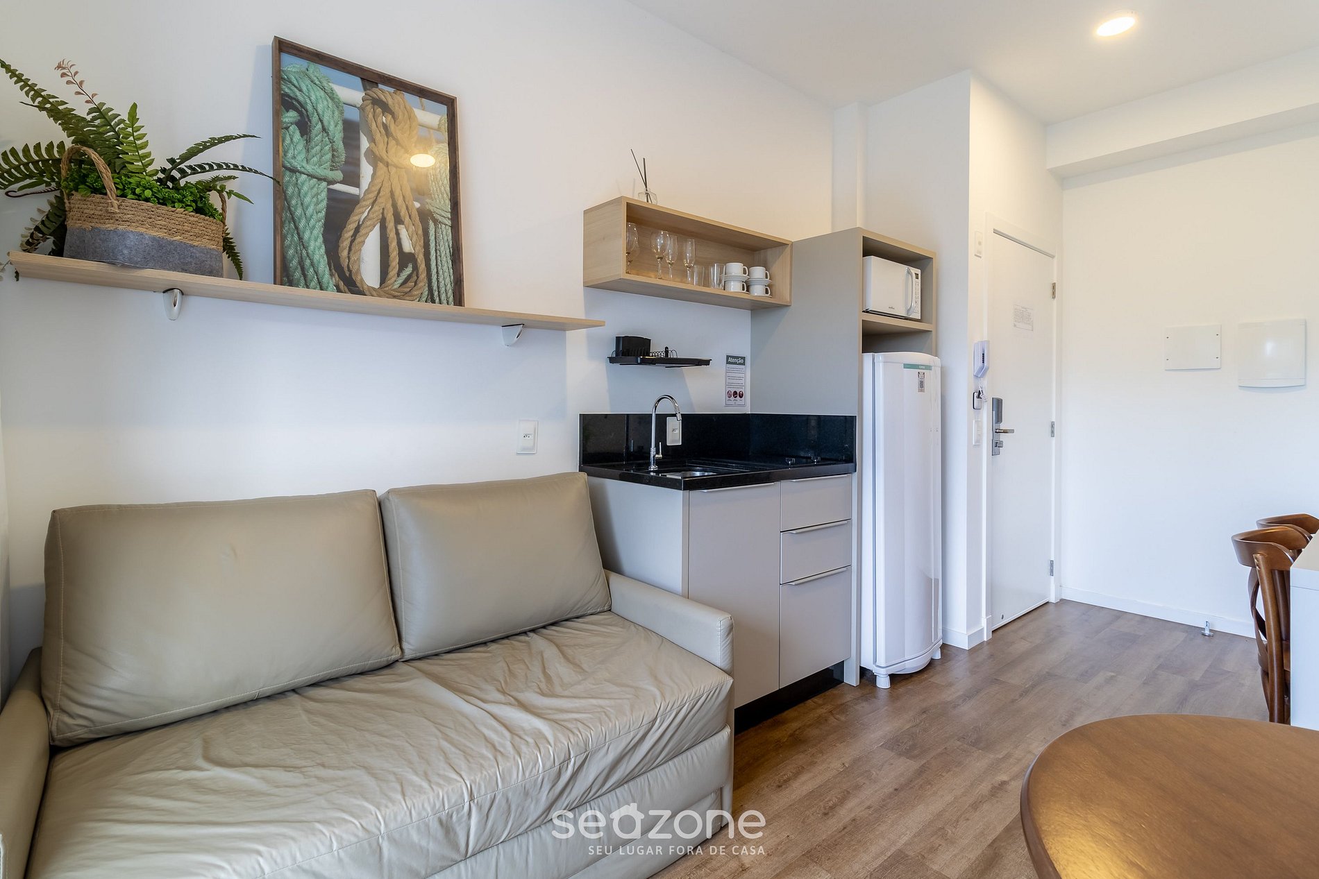 - Studio com sofá cama casal (comporta 1 adulto e 1 criança de até 12 anos), cama casal queen size, armário, TV e cozinha integrada;