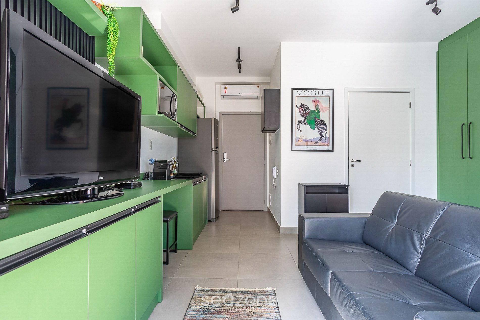 - 1 estúdio com cama de casal, sofá, armário, TV e ar-condicionado;