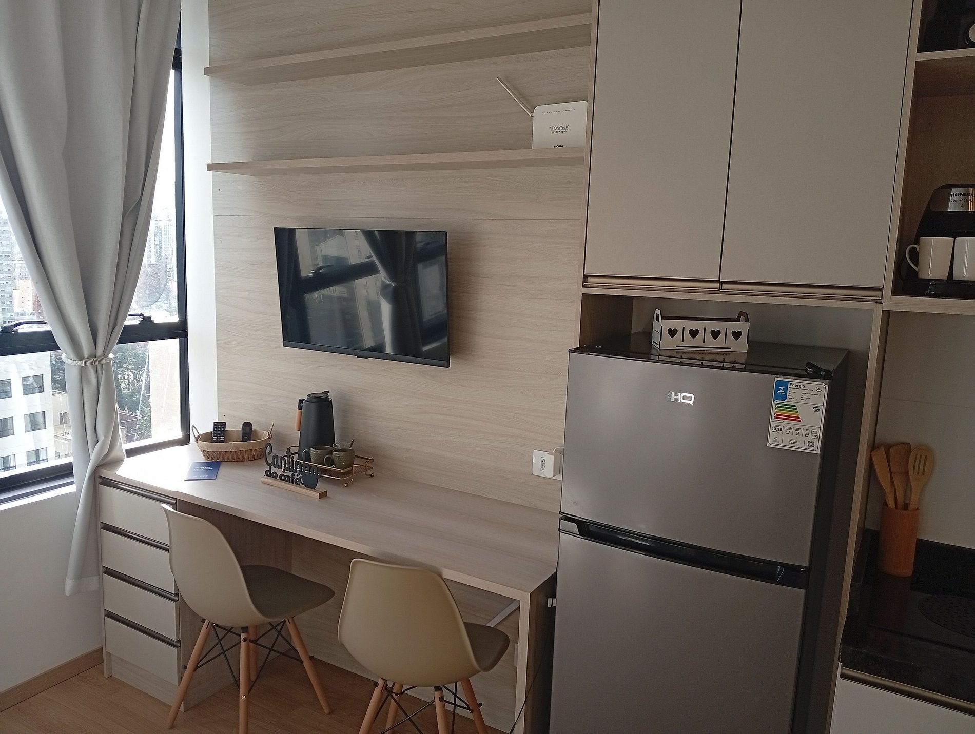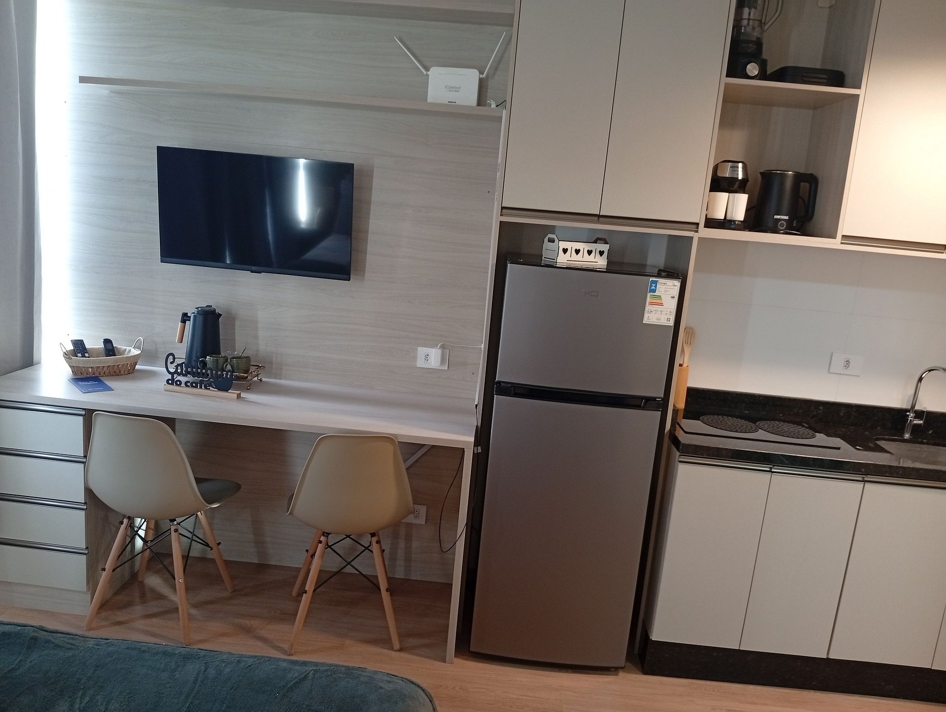 - Cozinha completa com geladeira, cooktop de indução, micro-ondas, airfryer, sanduicheira, cafeteira elétrica, chaleira elétrica, liquidificador, taças de vinho, panelas, louças e utensílios;