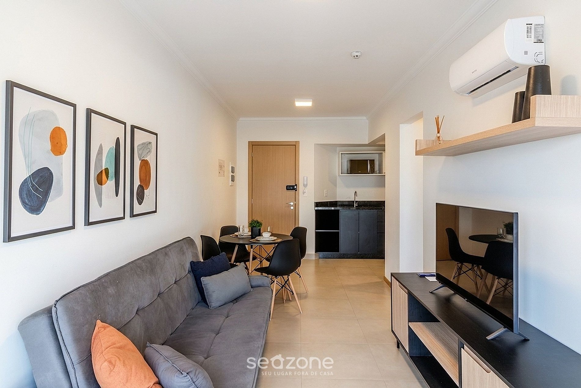 - Sala de estar com sofá-cama e Smart TV;