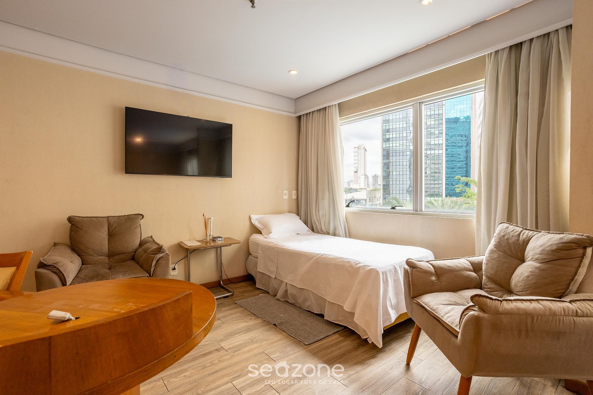 Seja para trabalho ou lazer, este studio oferece flexibilidade com cama king e cama adicional, ideal para diferentes perfis de viagem. O condomínio conta com piscina ao ar livre, piscina coberta e aquecida, sauna, academia e áreas de descanso. Localização privilegiada próxima ao Insper, Faria Lima e Parque do Povo.