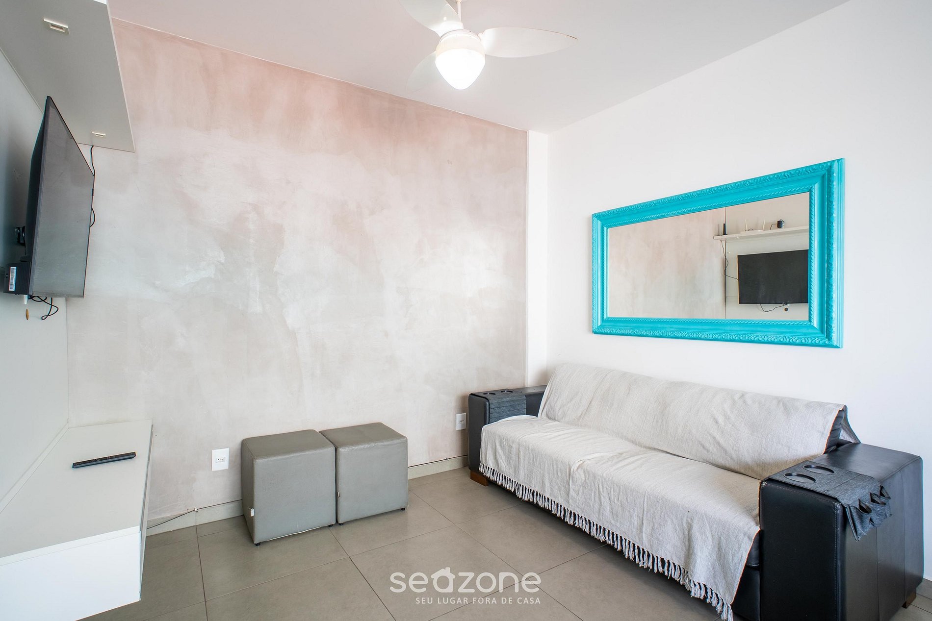 - Sala de estar com sofá, ventilador de teto e Smart TV;