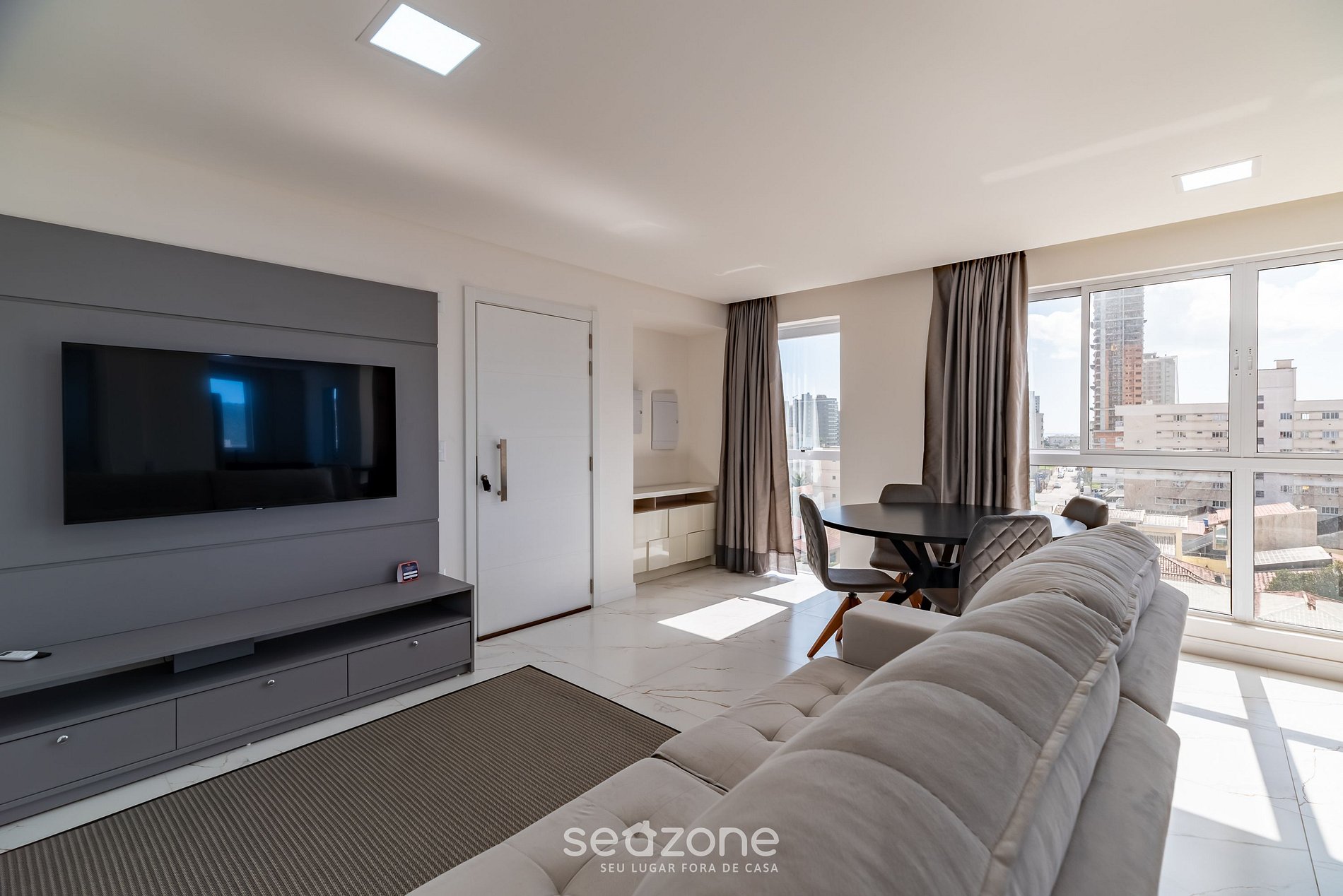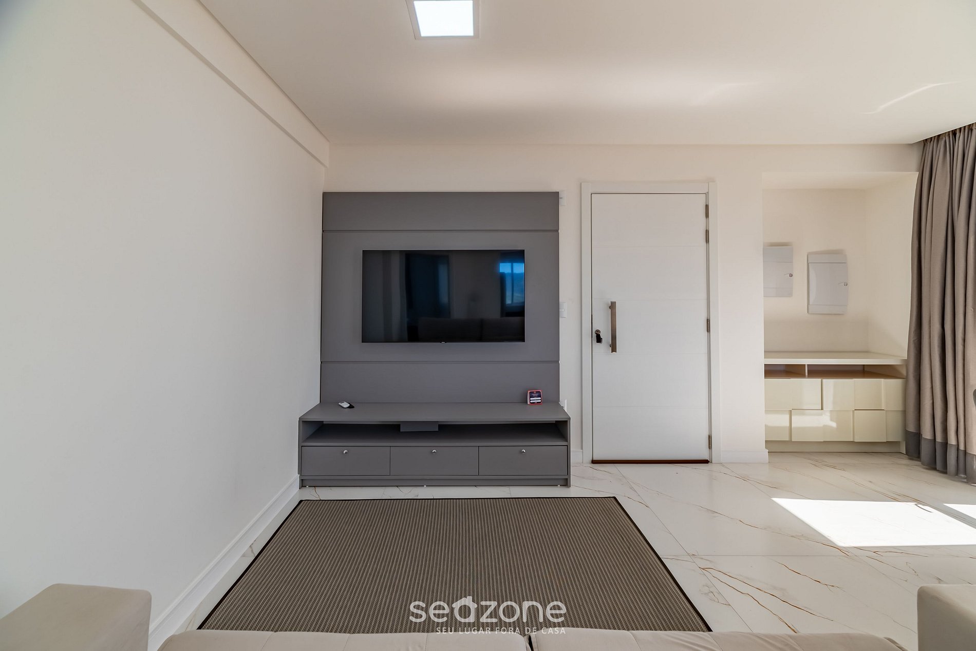 - Sala de estar com sofá, smart TV de tela plana e ar-condicionado;