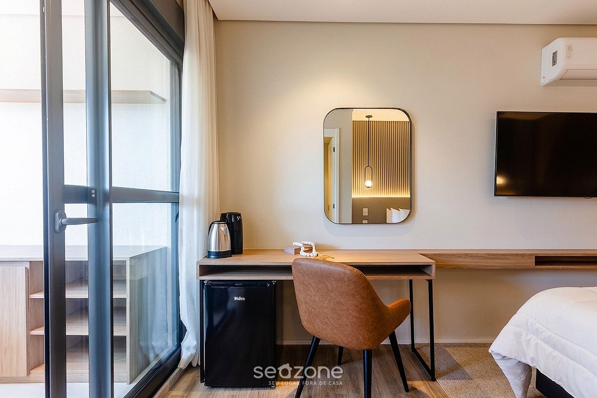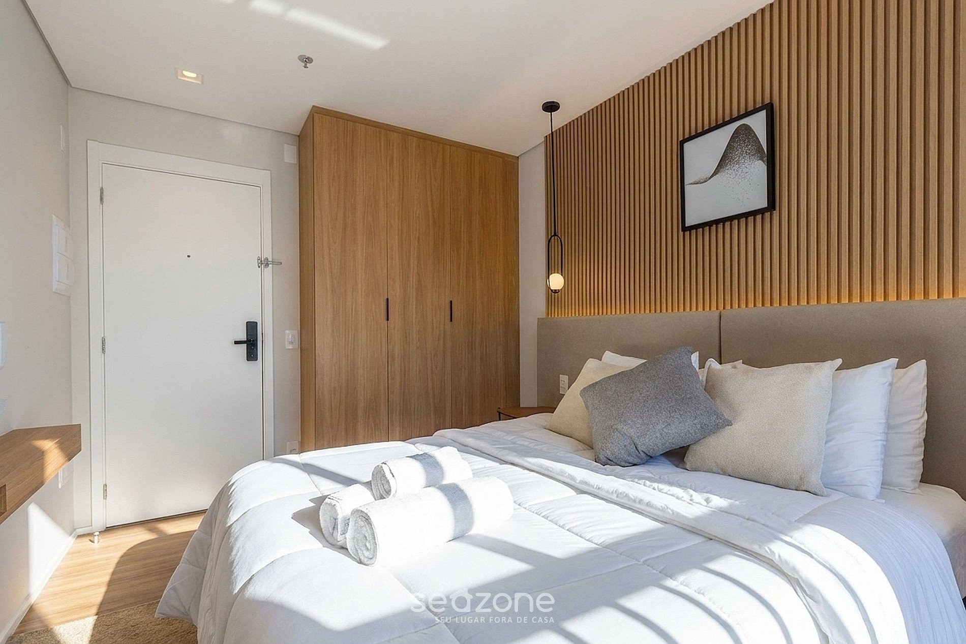 - Estúdio com 1 Cama Queen size, armário e ar-condicionado;