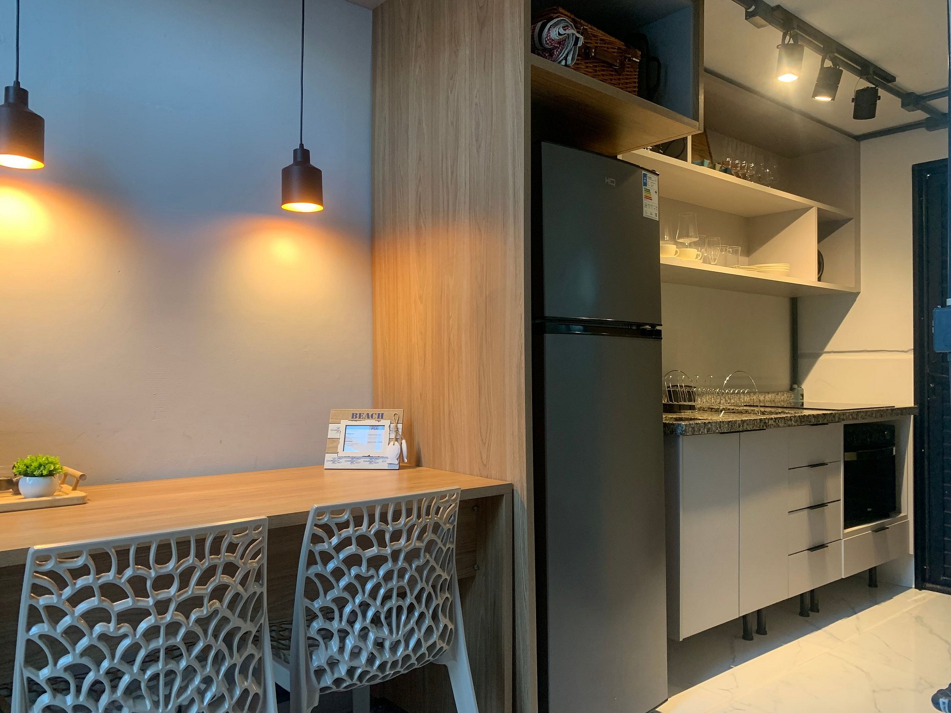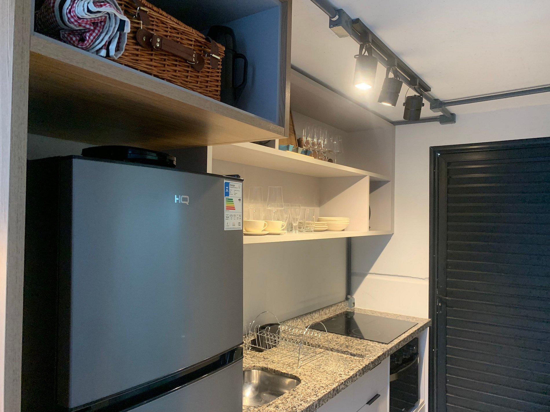 - Cozinha completa com geladeira, fogão cooktop de indução, forno elétrico, micro-ondas, sanduicheira, cafeteira elétrica, chaleira elétrica, liquidificador, taças de vinho, panelas, louças e utensílios;