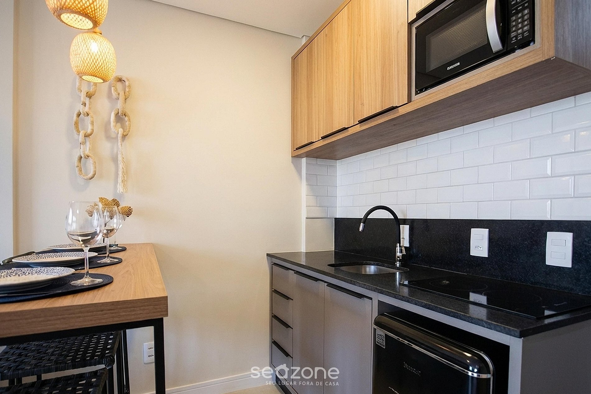 - Cozinha completa com frigobar, fogão cooktop, micro-ondas, sanduicheira, cafeteira elétrica, liquidificador, abridor de vinho, panelas, louças e utensílios;