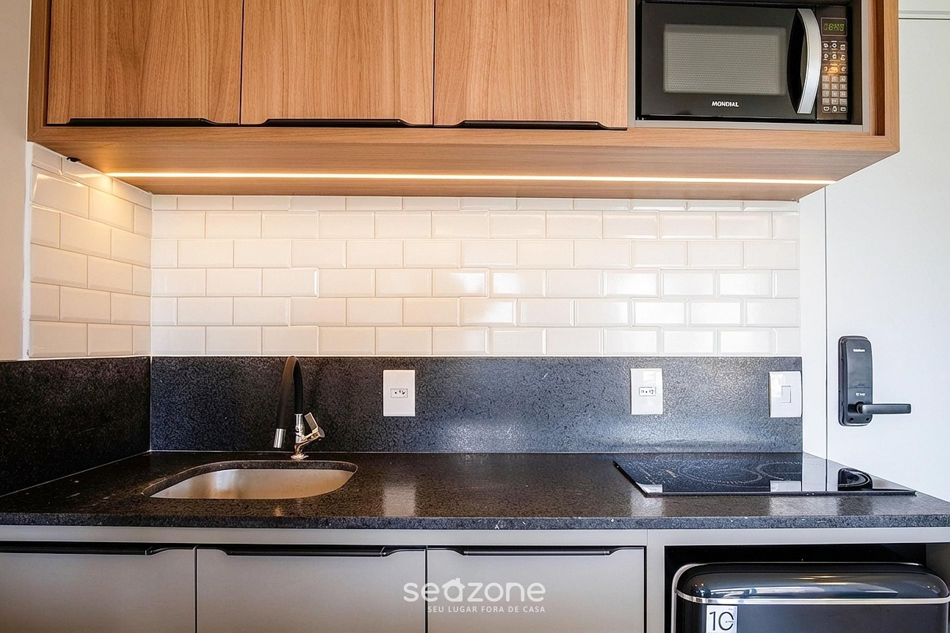 - Cozinha com cooktop de indução, frigobar, micro-ondas, sanduicheira, cafeteira elétrica, liquidificador, taças de vinho, panelas, louças e utensílios;