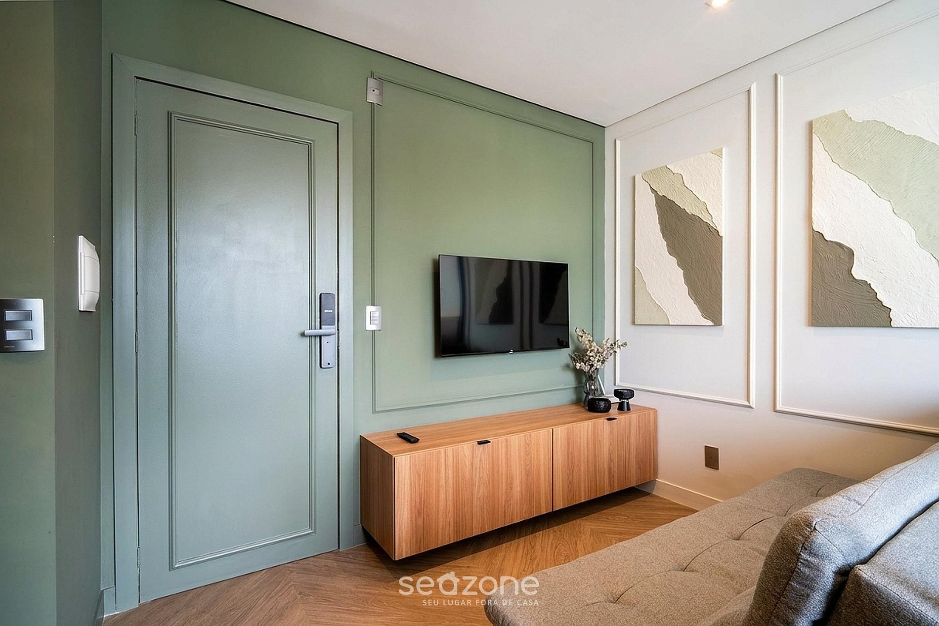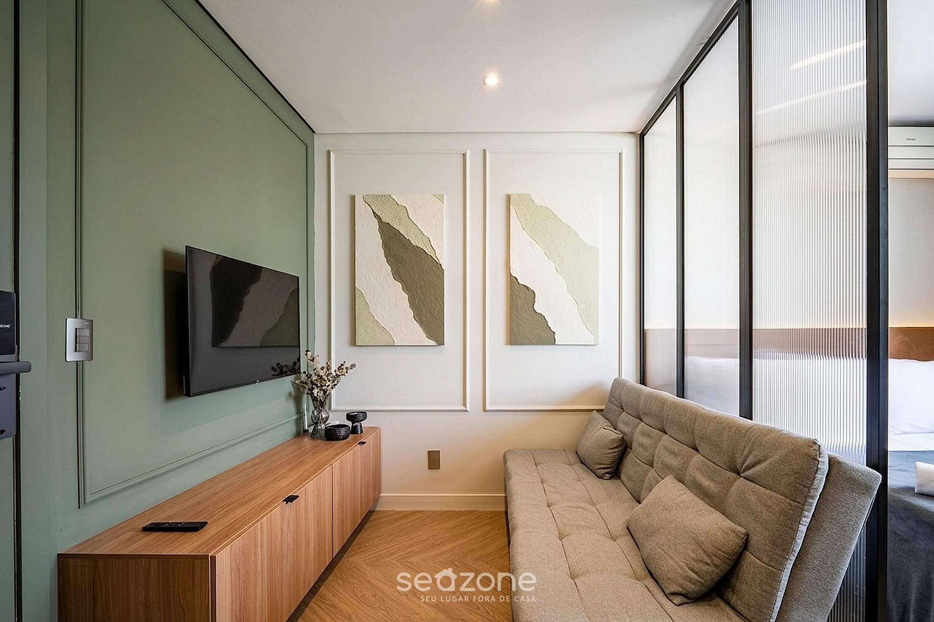 - Estúdio com 1 cama queen size, 1 sofá-cama de casal, Smart TV e ar-condicionado split;