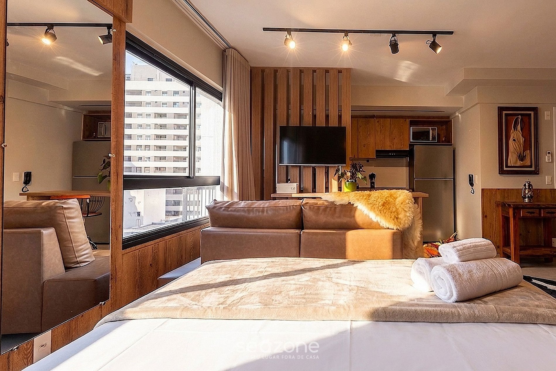 - Estúdio integrado com 1 cama de casal, armário, sofá e ar-condicionado;