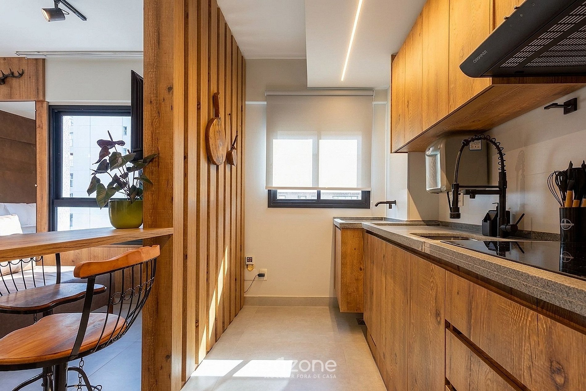 - Cozinha equipada com geladeira, freezer, fogão cooktop de indução, sanduicheira, liquidificador, panelas, louças e utensílios;