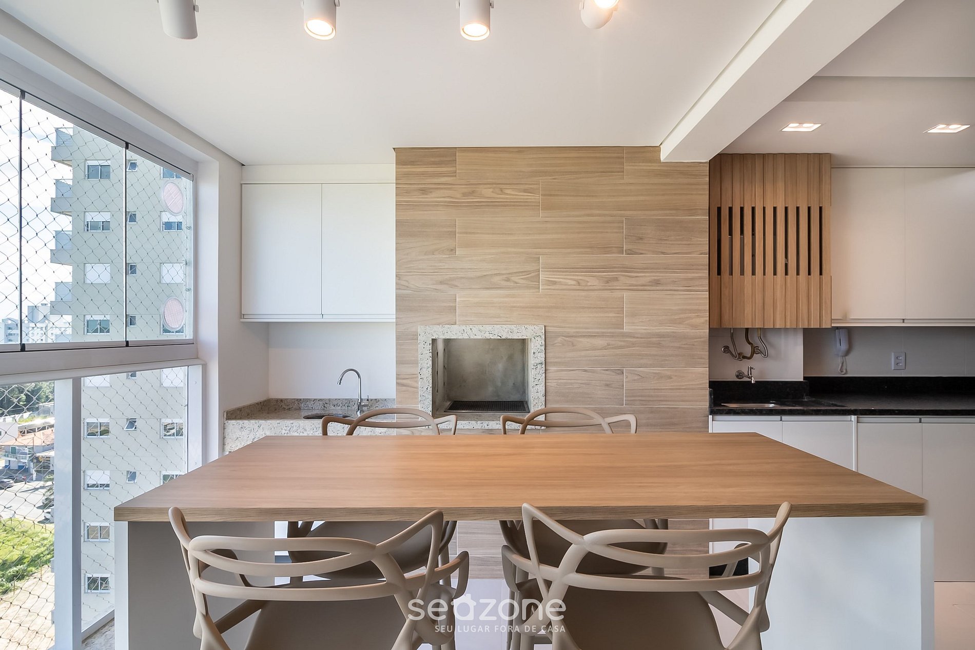 - Sacada integrada com churrasqueira, bancada e 4 banquetas;