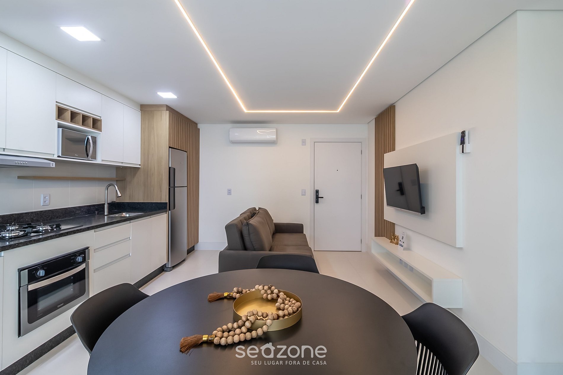 - Sala de estar com sofá, Smart TV, mesa com 4 cadeiras e ar-condicionado;