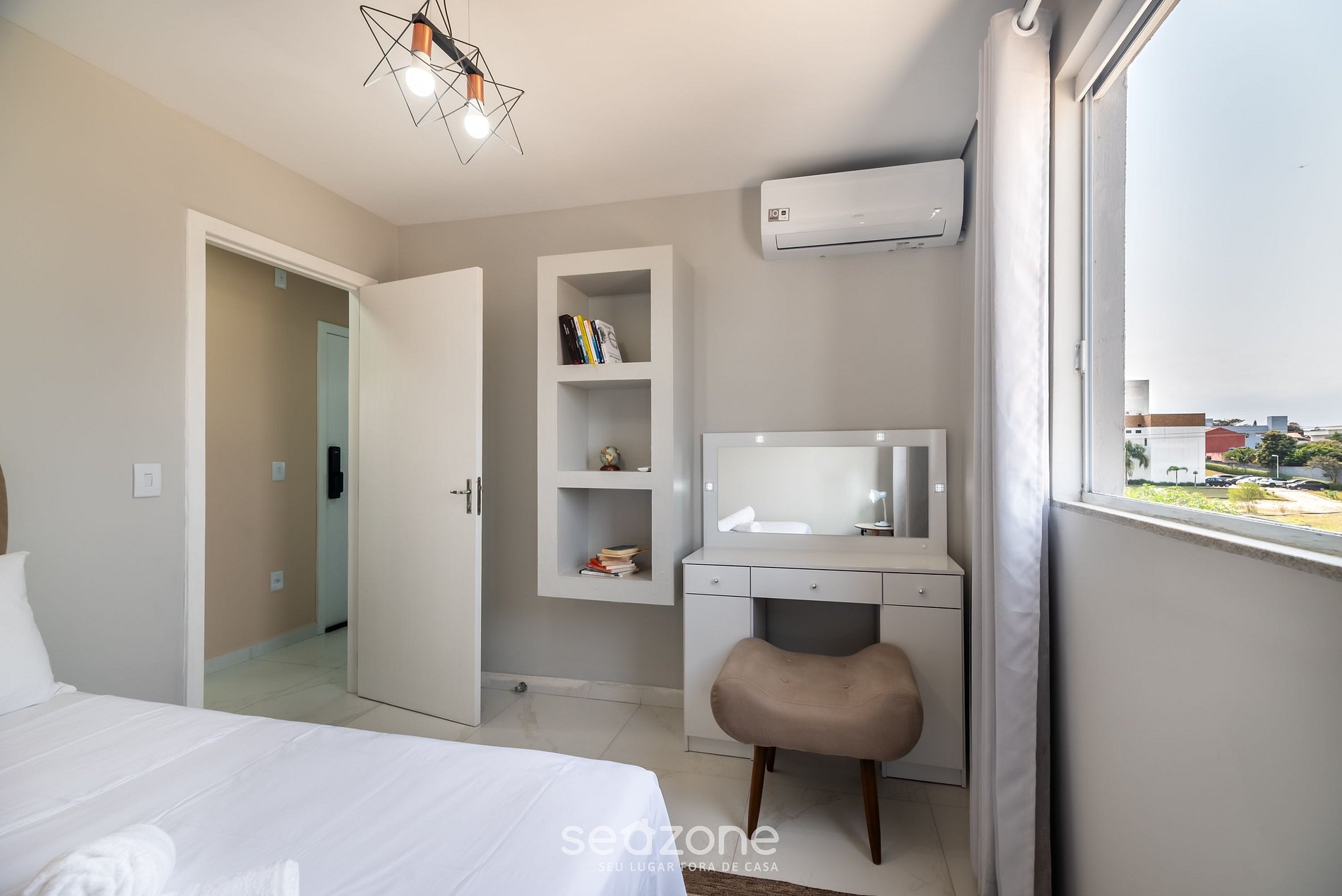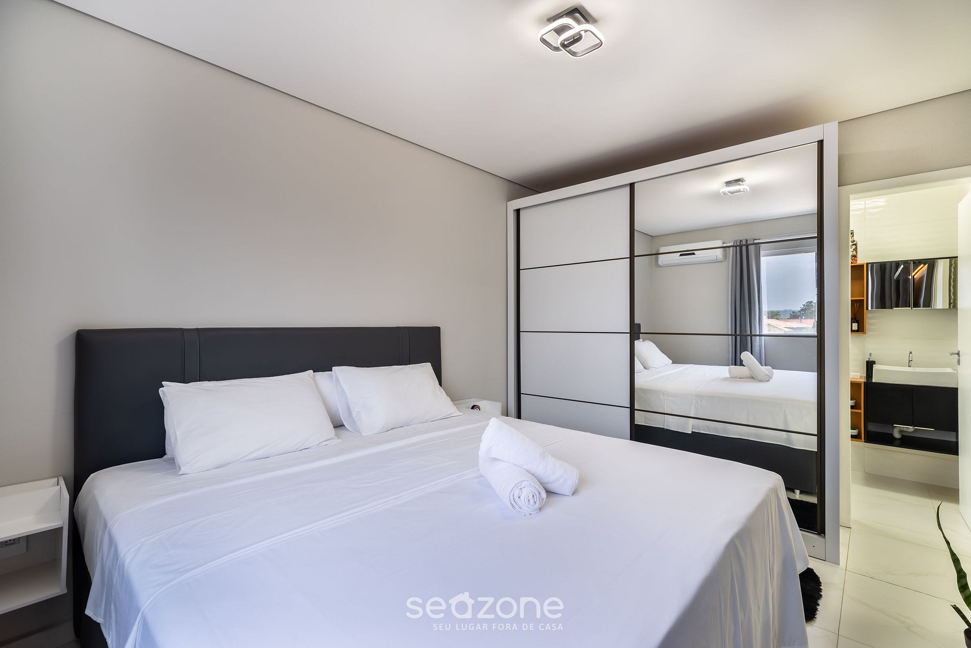 - 1 Suíte com cama de casal king size, cortinas blackout, armário, Smart TV de tela plana e ar-condicionado;