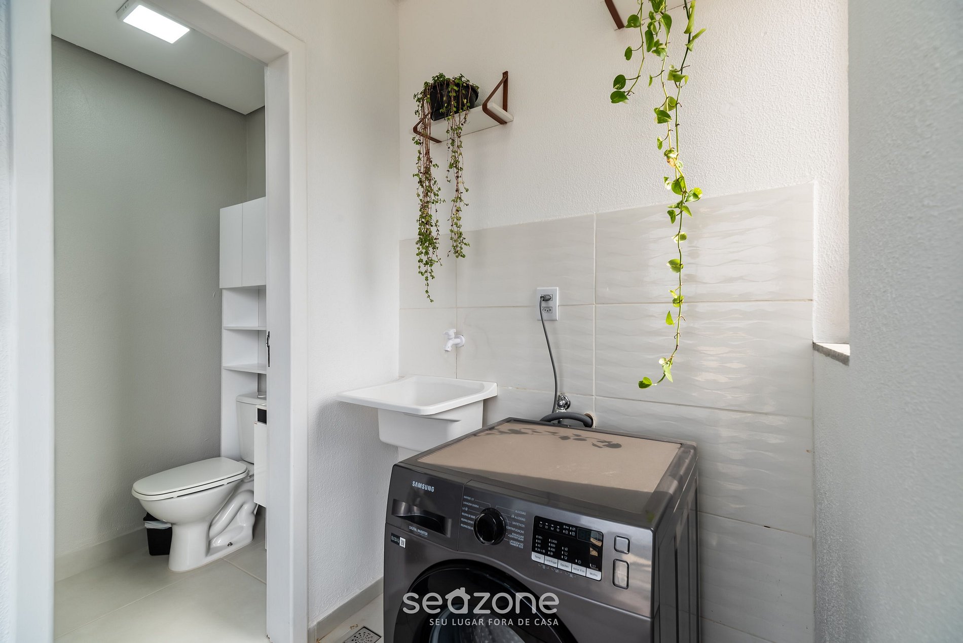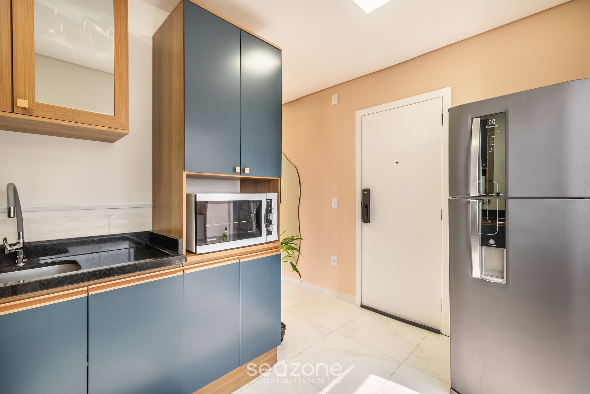 - Cozinha completa com geladeira, cooktop, forno elétrico, airfryer, micro-ondas, sanduicheira, cafeteira elétrica, chaleira elétrica, liquidificador, taças de vinho, panelas, louças e utensílios;