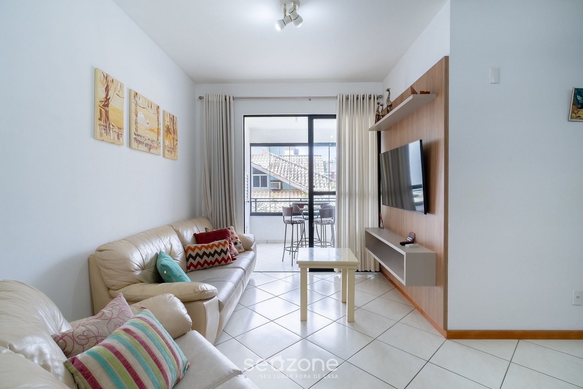 - Sala de estar com sofá, TV e ar-condicionado;