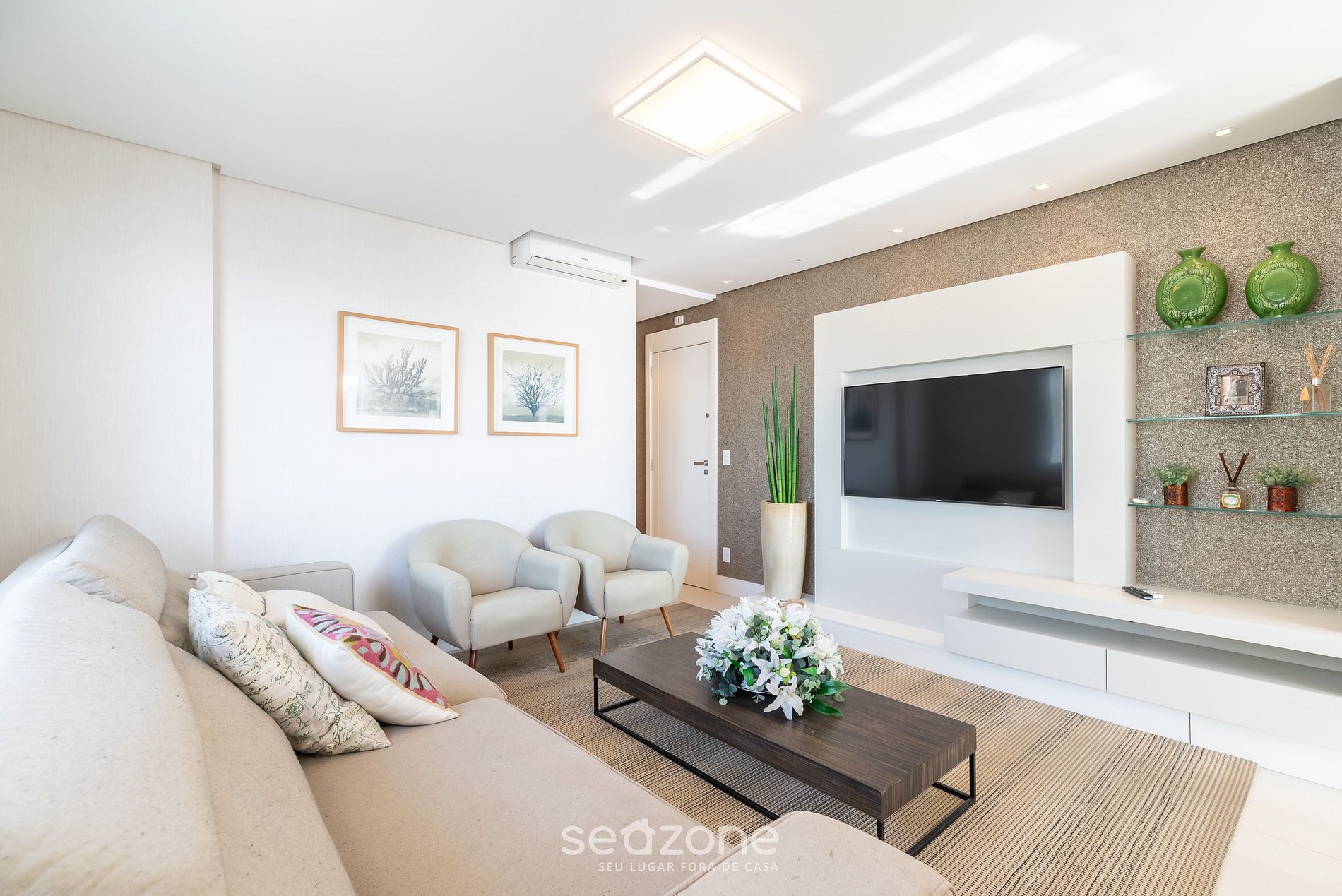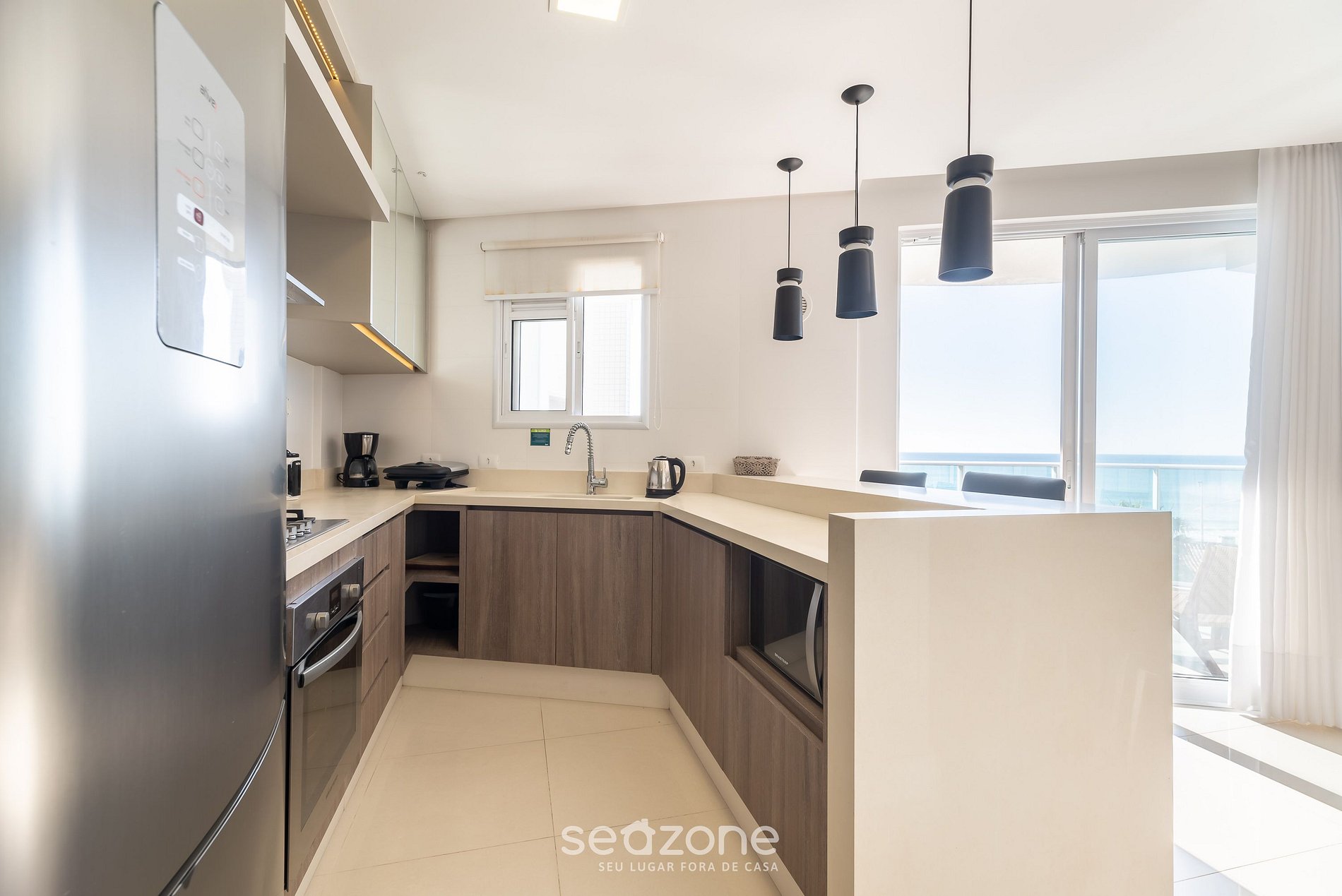 - Varanda com vista para o mar, churrasqueira privativa e móveis externos;