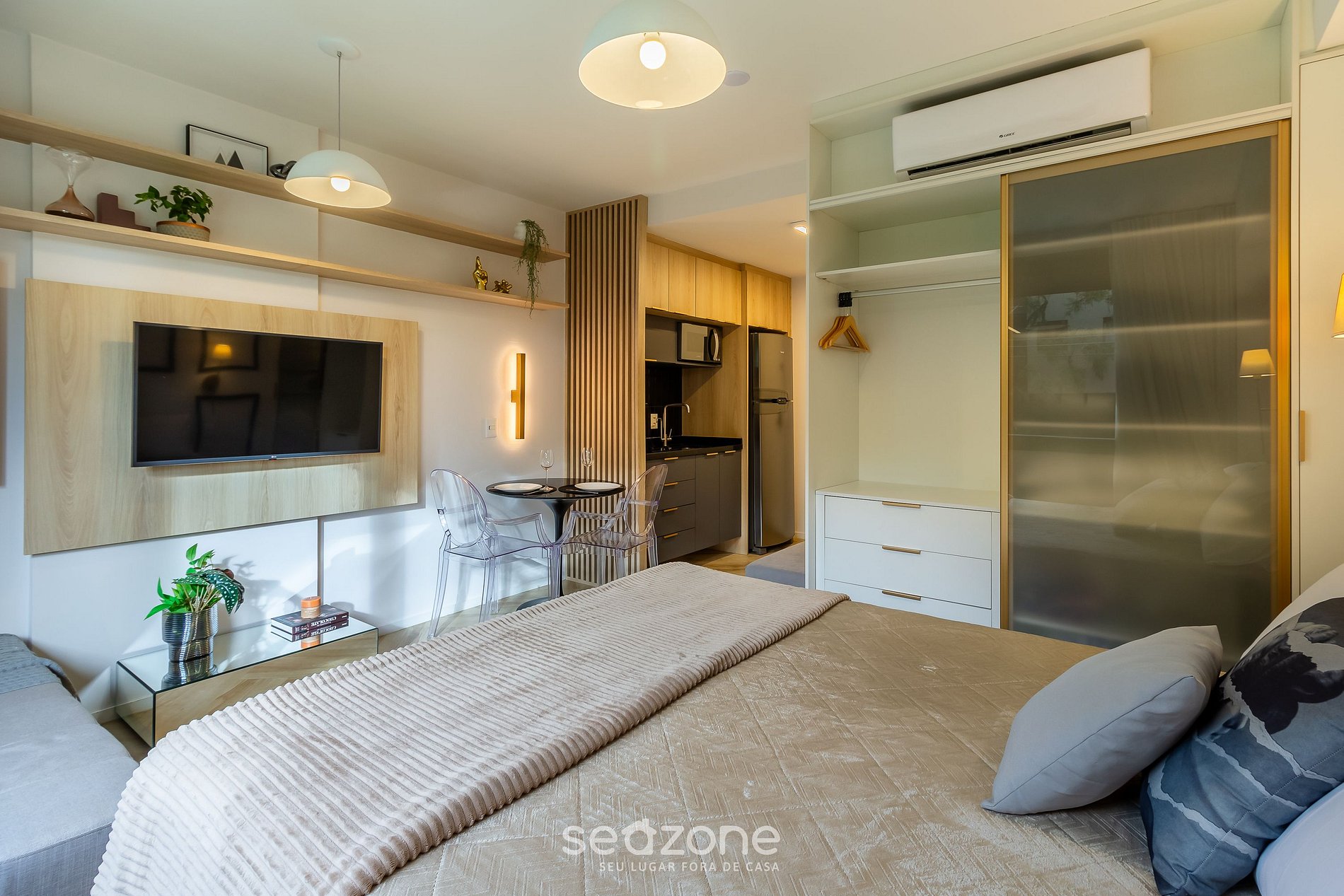 - 1 Estúdio com 1 cama de casal queen size, Televisão de tela plana, armário e ar-condicionado;
