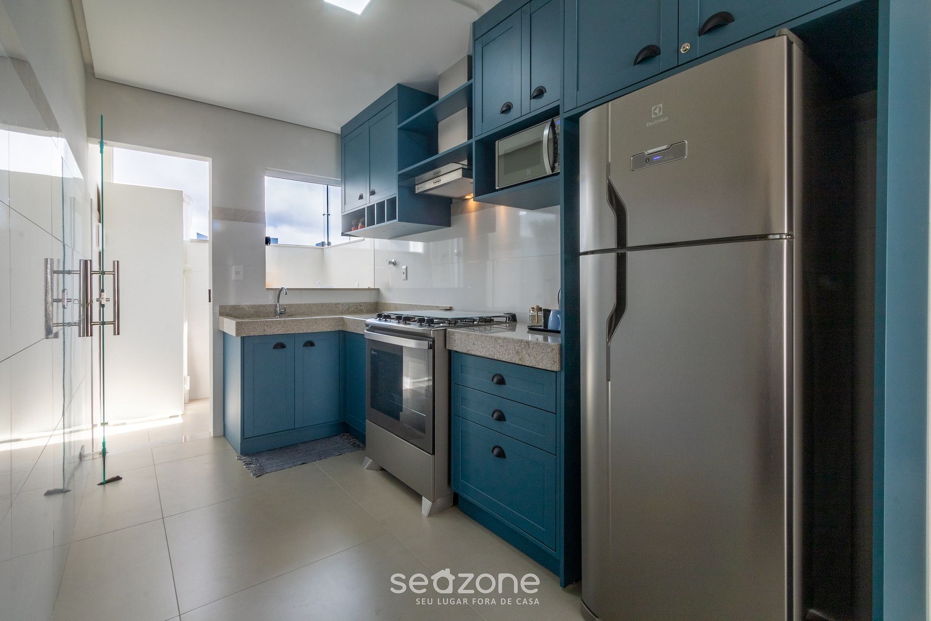 - Cozinha completa com geladeira, fogão, forno, micro-ondas, sanduicheira, Kit café (funil, garrafa térmica), chaleira, liquidificador, taças de vinho, panelas, louças e utensílios;