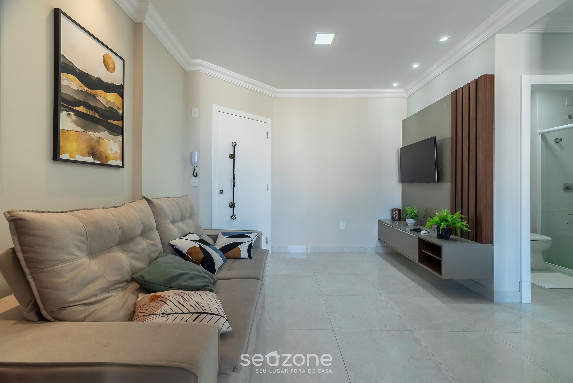 - Sala de estar com sofá, Smart TV de tela plana e ar-condicionado;