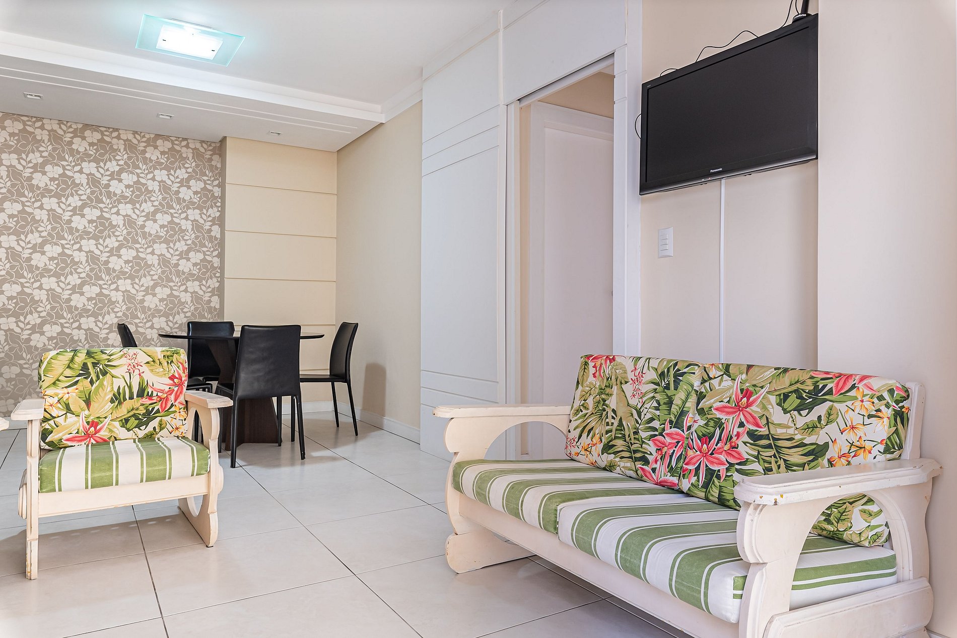- Sala de estar com sofá e TV de tela plana;