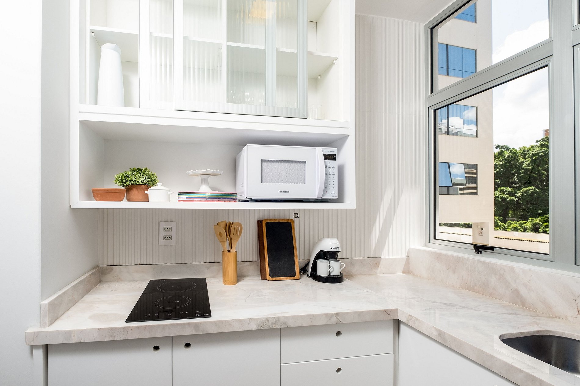 - Cozinha compacta com geladeira, fogão (indução 2 bocas), micro-ondas, cafeteira, sanduicheira e vários utensílios;