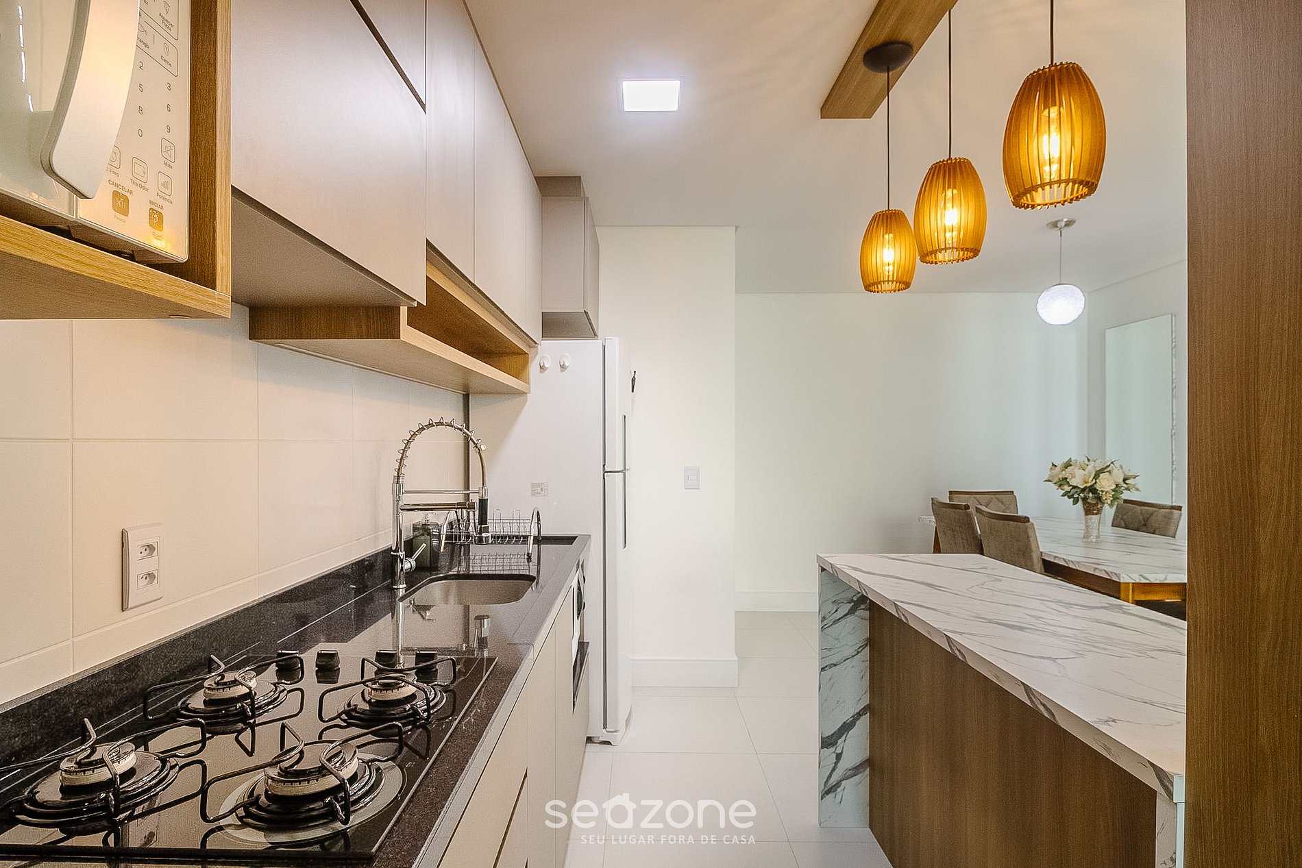 - Cozinha completa com geladeira, fogão cooktop, forno elétrico, micro-ondas, sanduicheira, cafeteira, chaleira elétrica, liquidificador, taças de vinho, panelas, louças e utensílios;