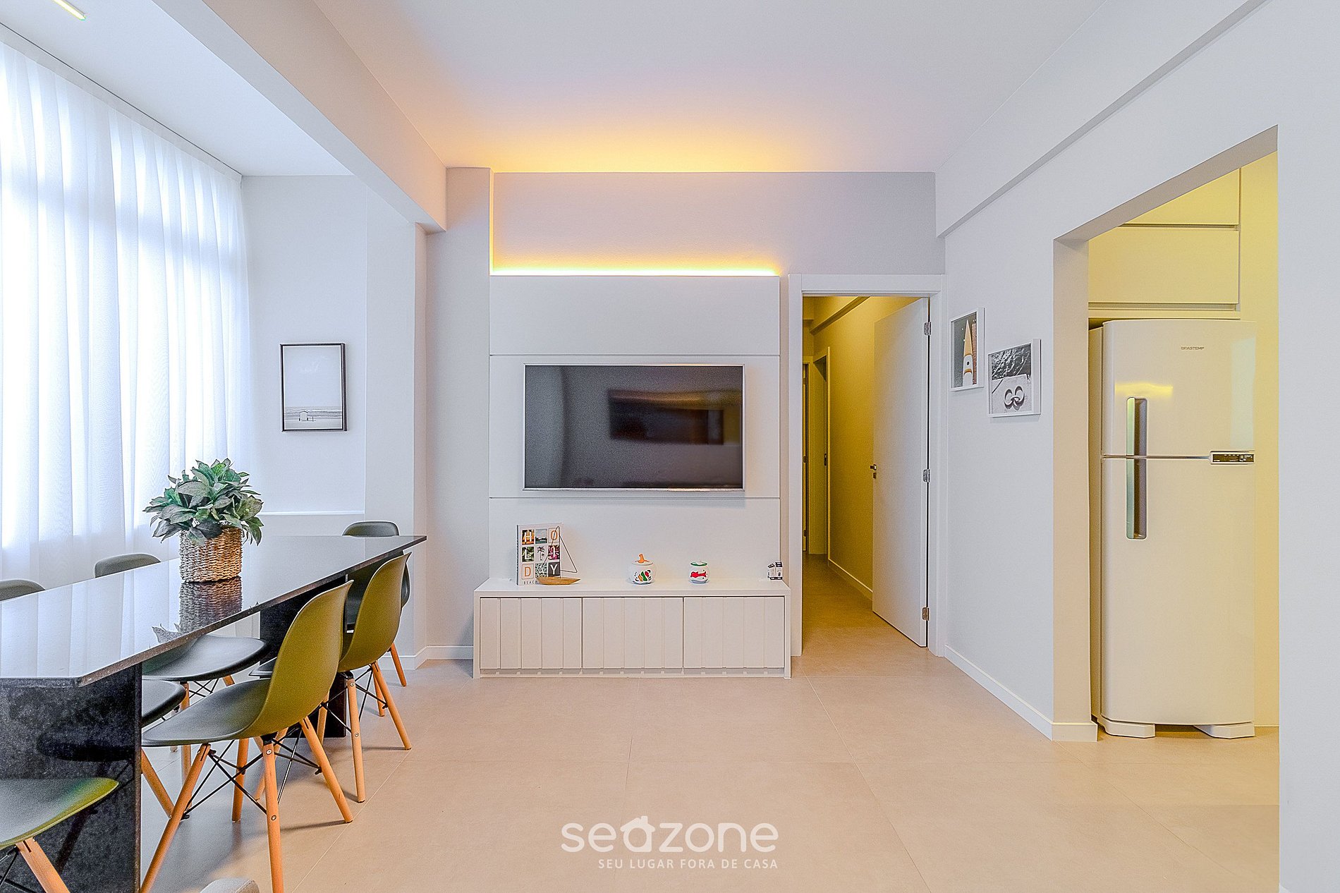 - Sala de estar com sofá, TV e mesa com 6 cadeiras;