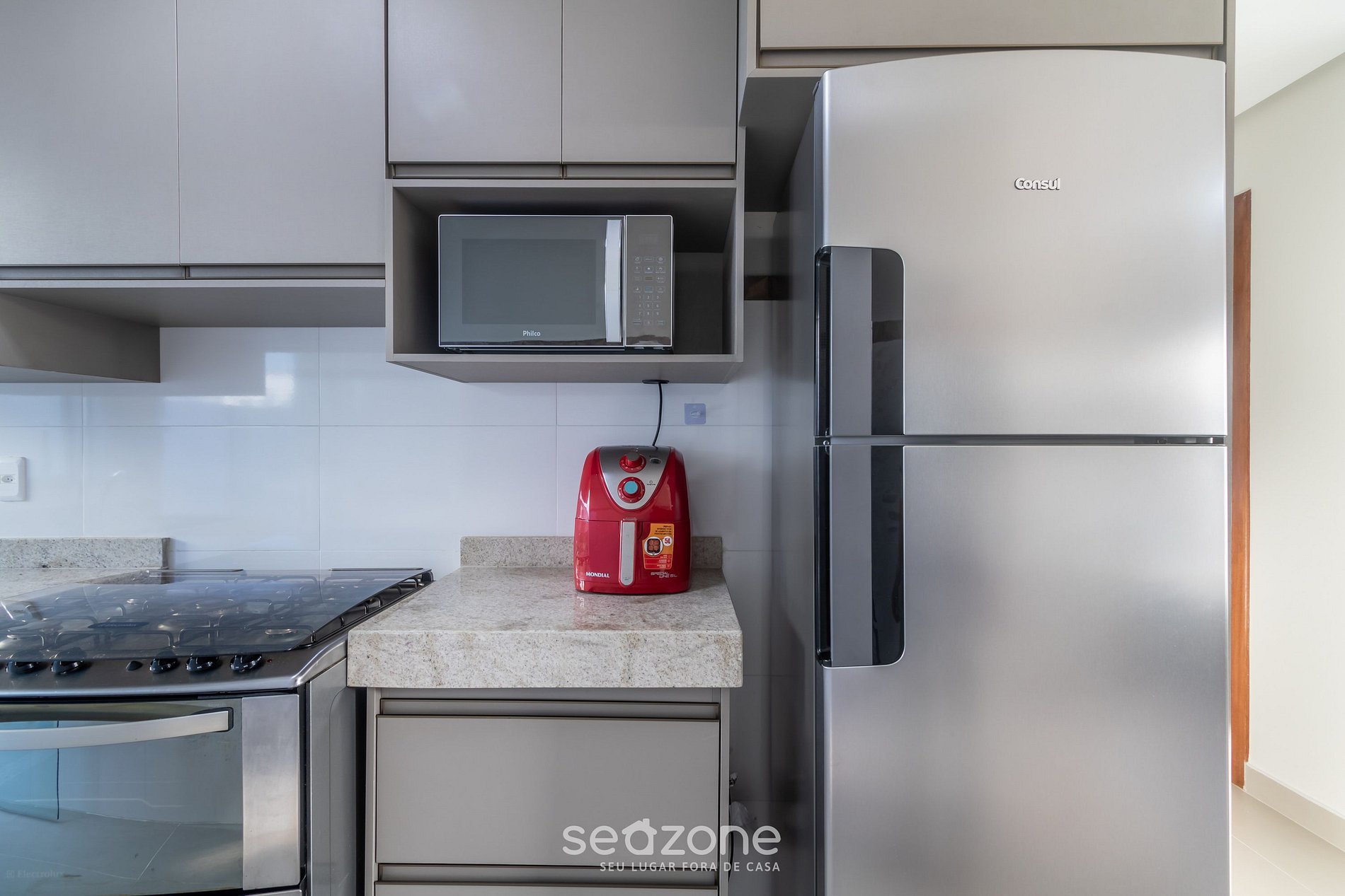 - Cozinha completa com geladeira, fogão e forno a gás, airfryer, micro-ondas, sanduicheira, cafeteira elétrica, chaleira comum, liquidificador, taças de vinho, panelas, louças e utensílios;