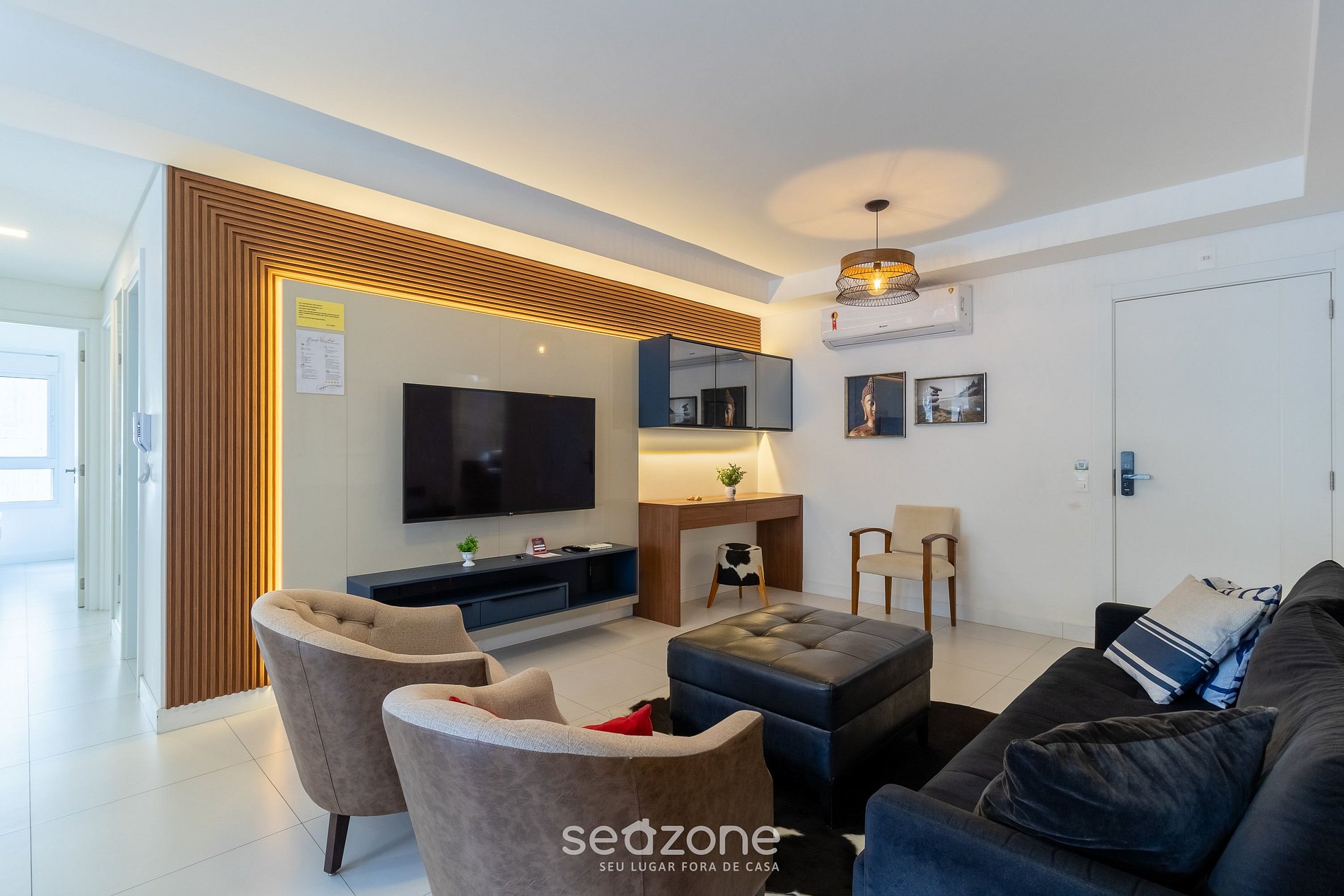 - Sala de estar com sofá, poltronas, puffs, Smart TV, ar-condicionado (espaço integrado com a cozinha);