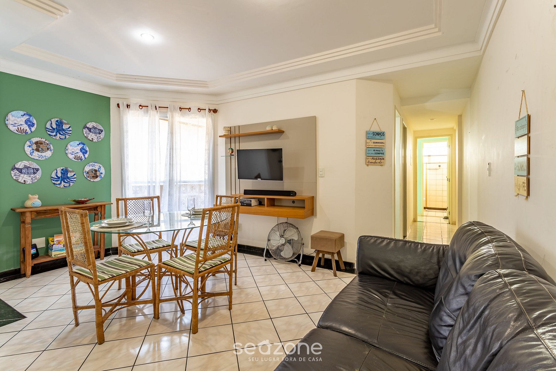 - Sala de estar com sof,á, smart TV e ventilador;