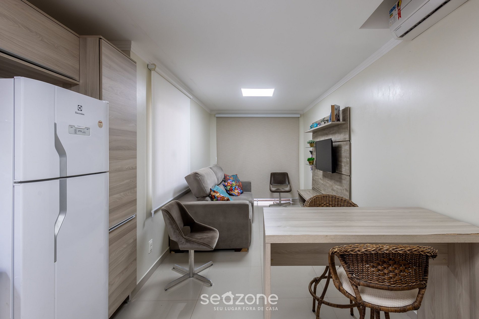- Sala de estar com sofá, smart TV e ar-condicionado;