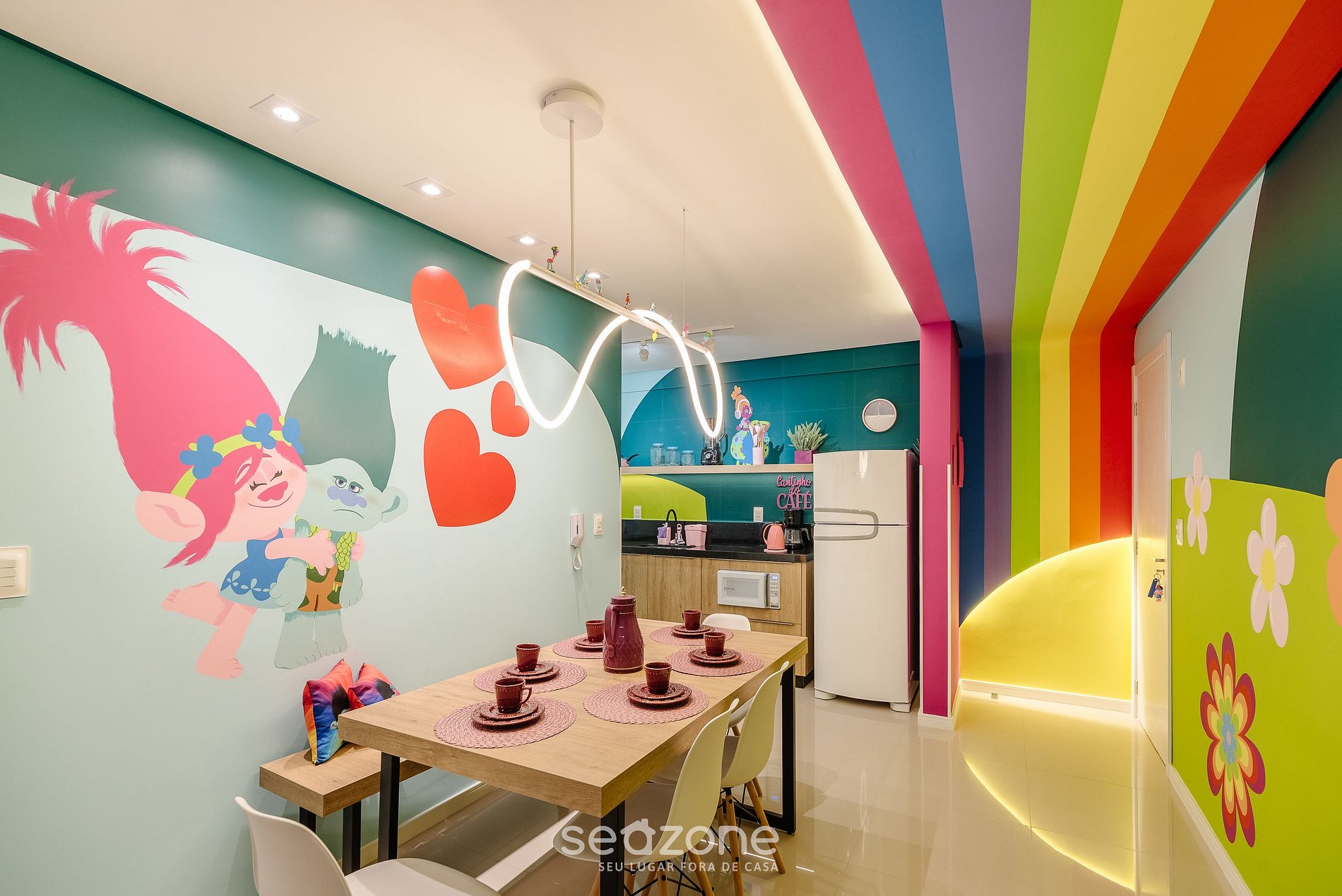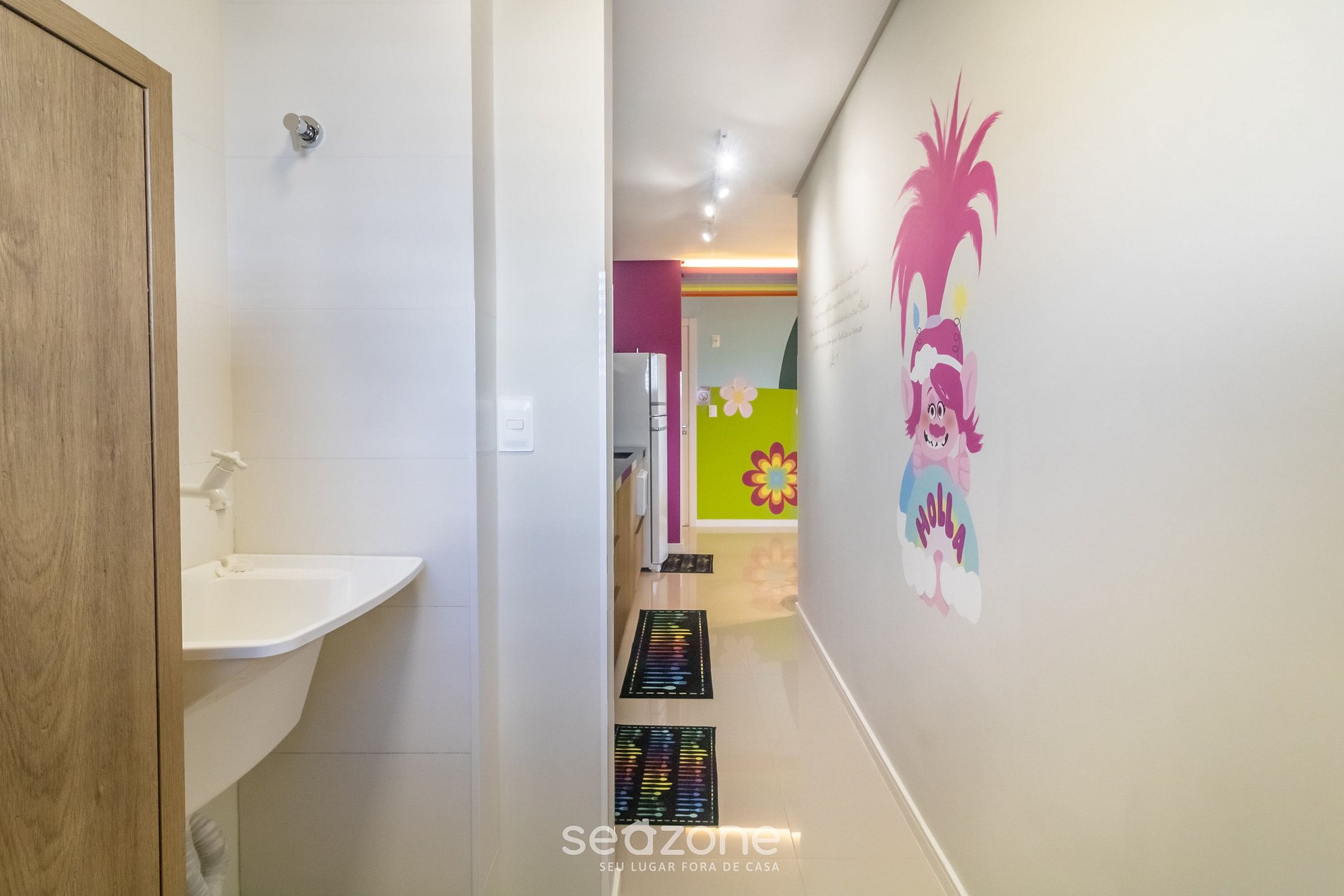 Venha relaxar neste lindo e decorado apartamento com baseado no filme Trolls, localizado em' Penha. Apenas 5 minutos a pé do Beto Carrero World. O imóvel conta com com 2 quartos temáticos, sala de estar, cozinha equipada e varanda com churrasqueira. Desfrute da proximidade com restaurantes e mercados, além de estar a 600 metros da Praia da Fortaleza.