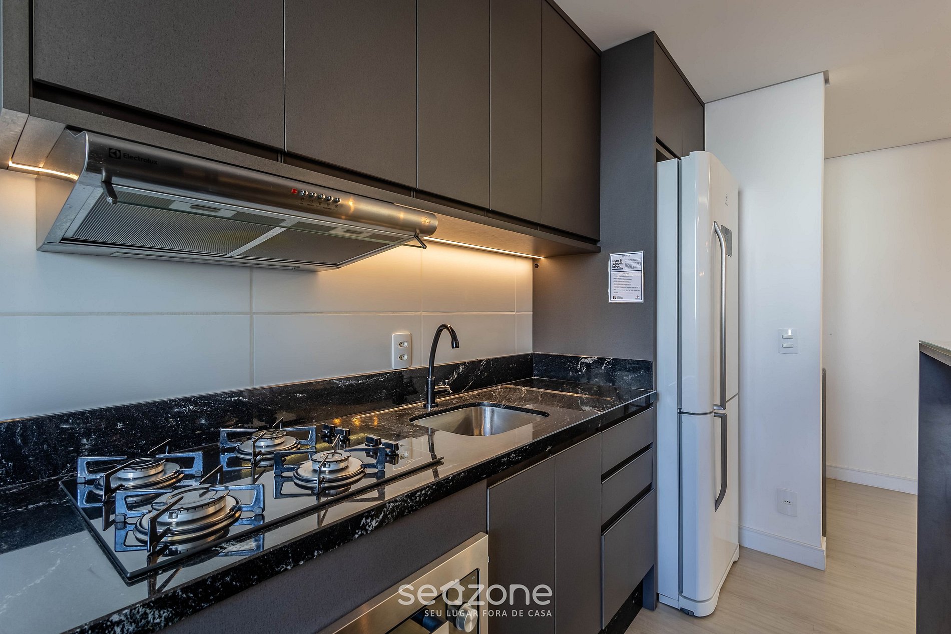 - Cozinha completa com geladeira, freezer, fogão cooktop, forno elétrico, micro-ondas, sanduicheira, cafeteira, chaleira elétrica, liquidificador, taças de vinho, panelas, louças e utensílios;