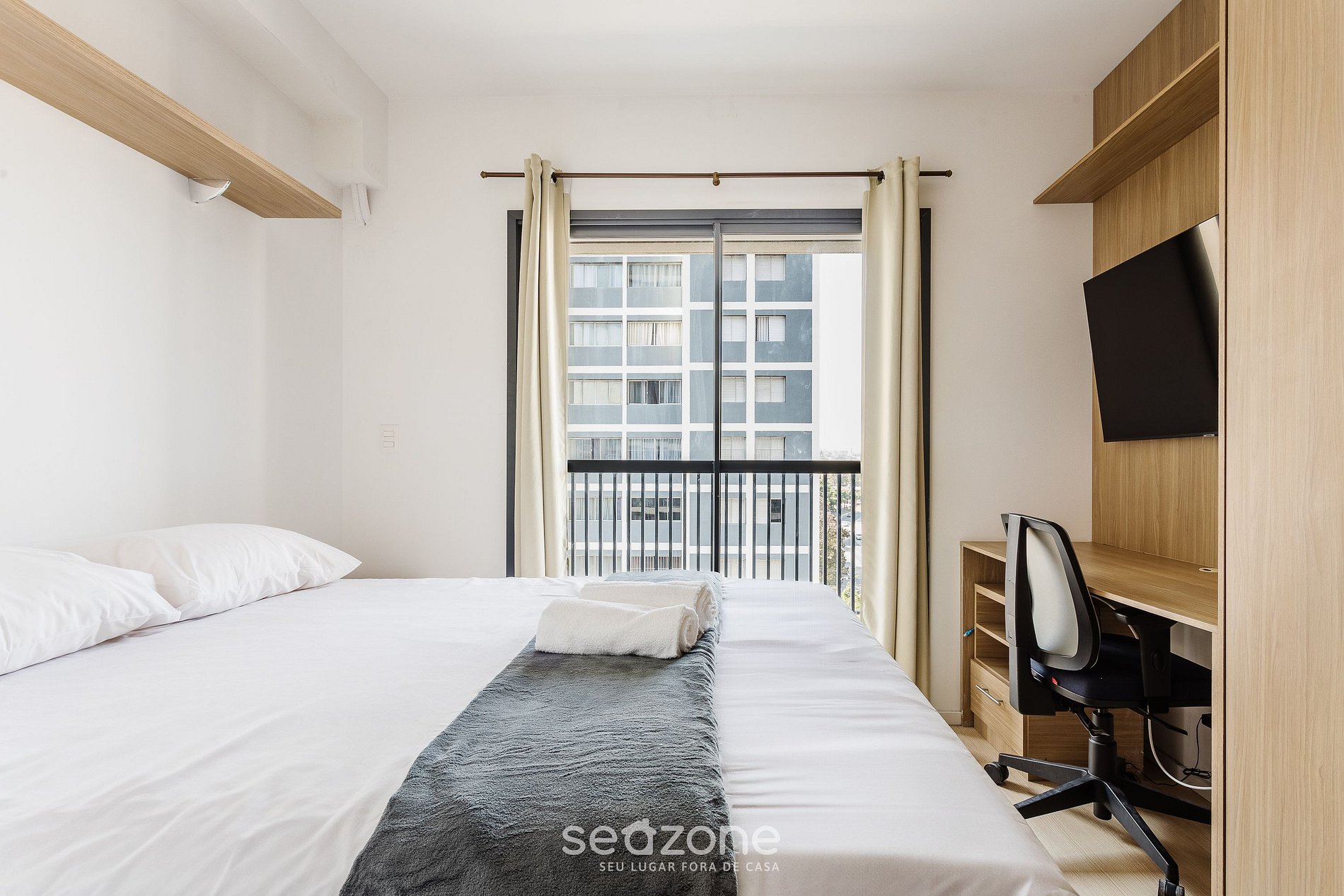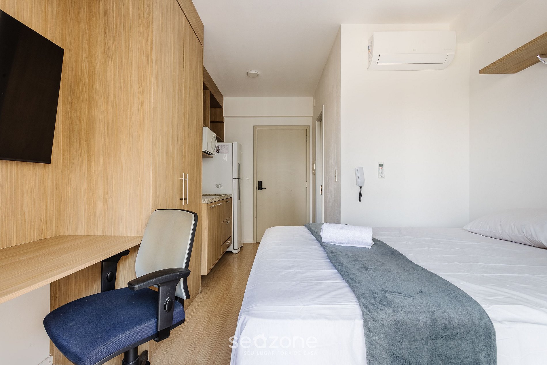 - Estúdio com 1 cama de casal queen size, armário, smart TV e ar-condicionado;