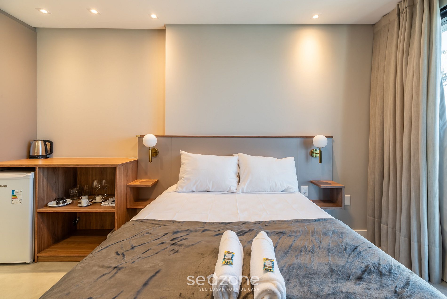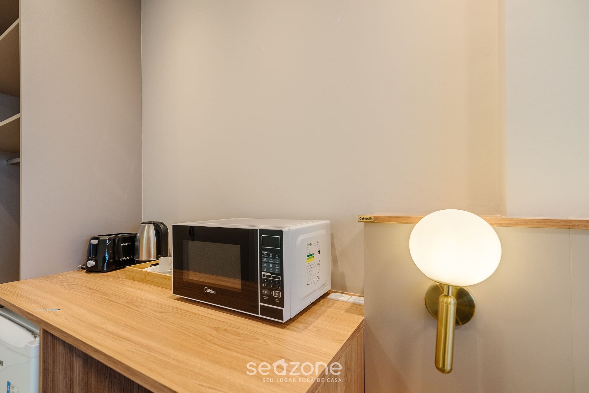 - Cozinha compacta com micro-ondas (sua opção prática para refeições rápidas durante a estadia), além de frigobar, chaleira elétrica, taças de vinho, louças e utensílios essenciais para o dia a dia;