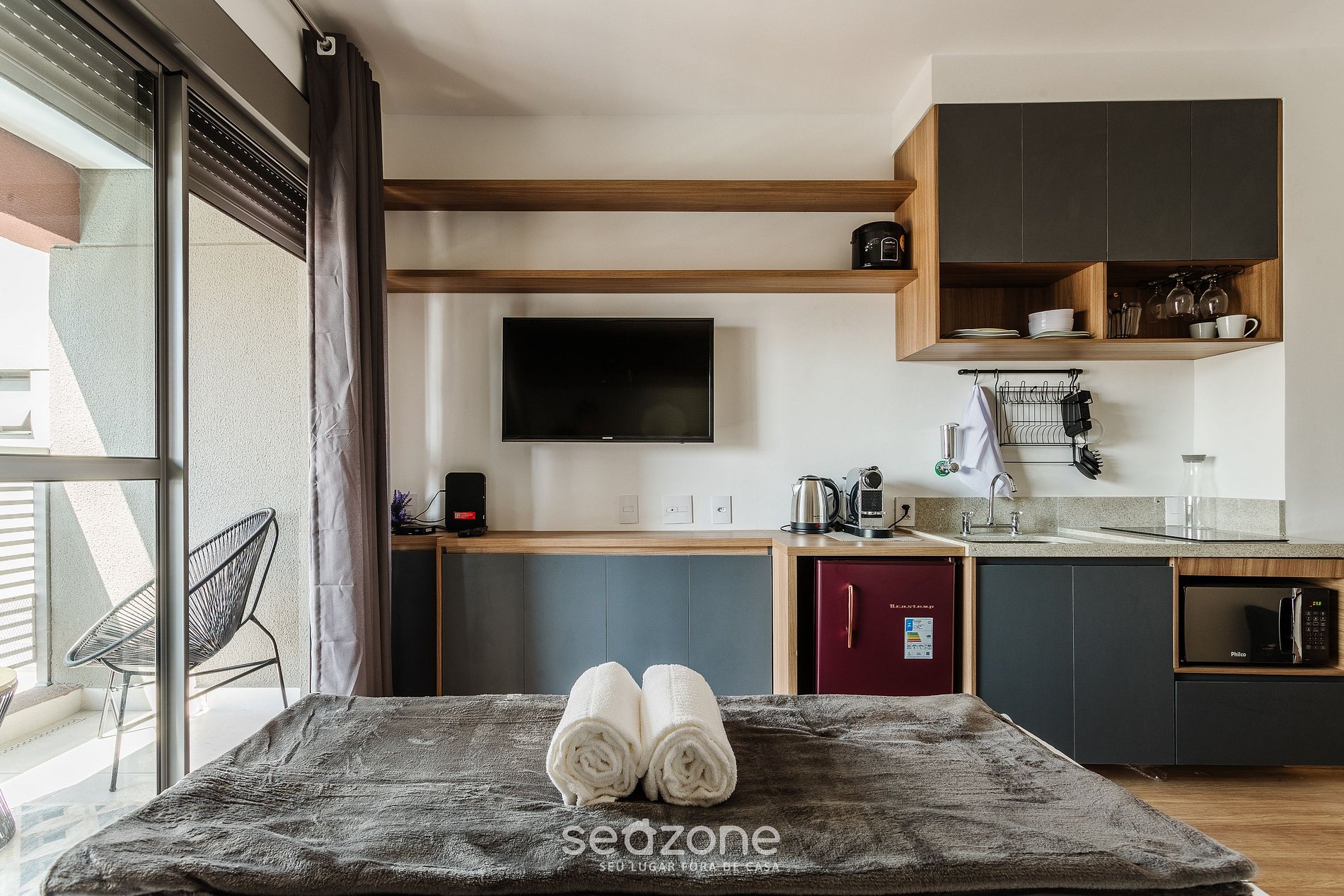 - Roupas de cama e banho de qualidade hoteleira (roupas de cama e toalhas extras são cobrados pela Seazone);