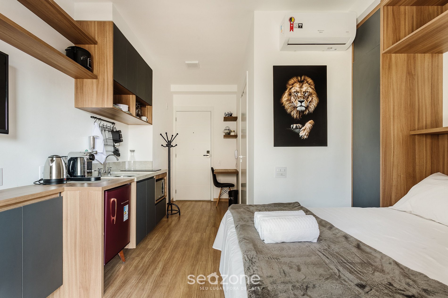 - Estúdio com cama de casal, arara para roupas, armário, Smart TV de tela plana e ar-condicionado;